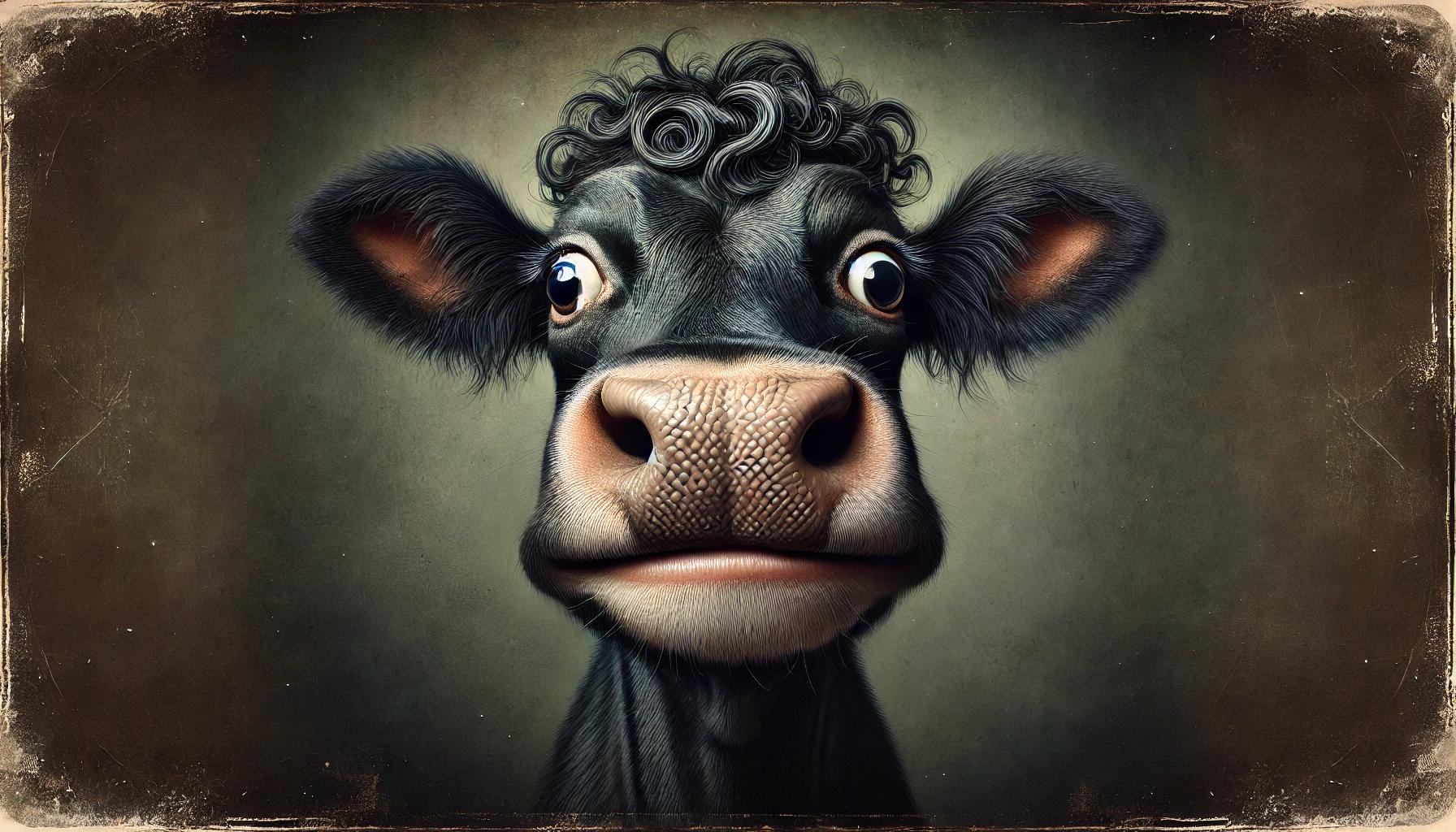 A matte heirloom-style portrait of a black cow, a cheeky and funny farm animal headshot full of rustic charm.