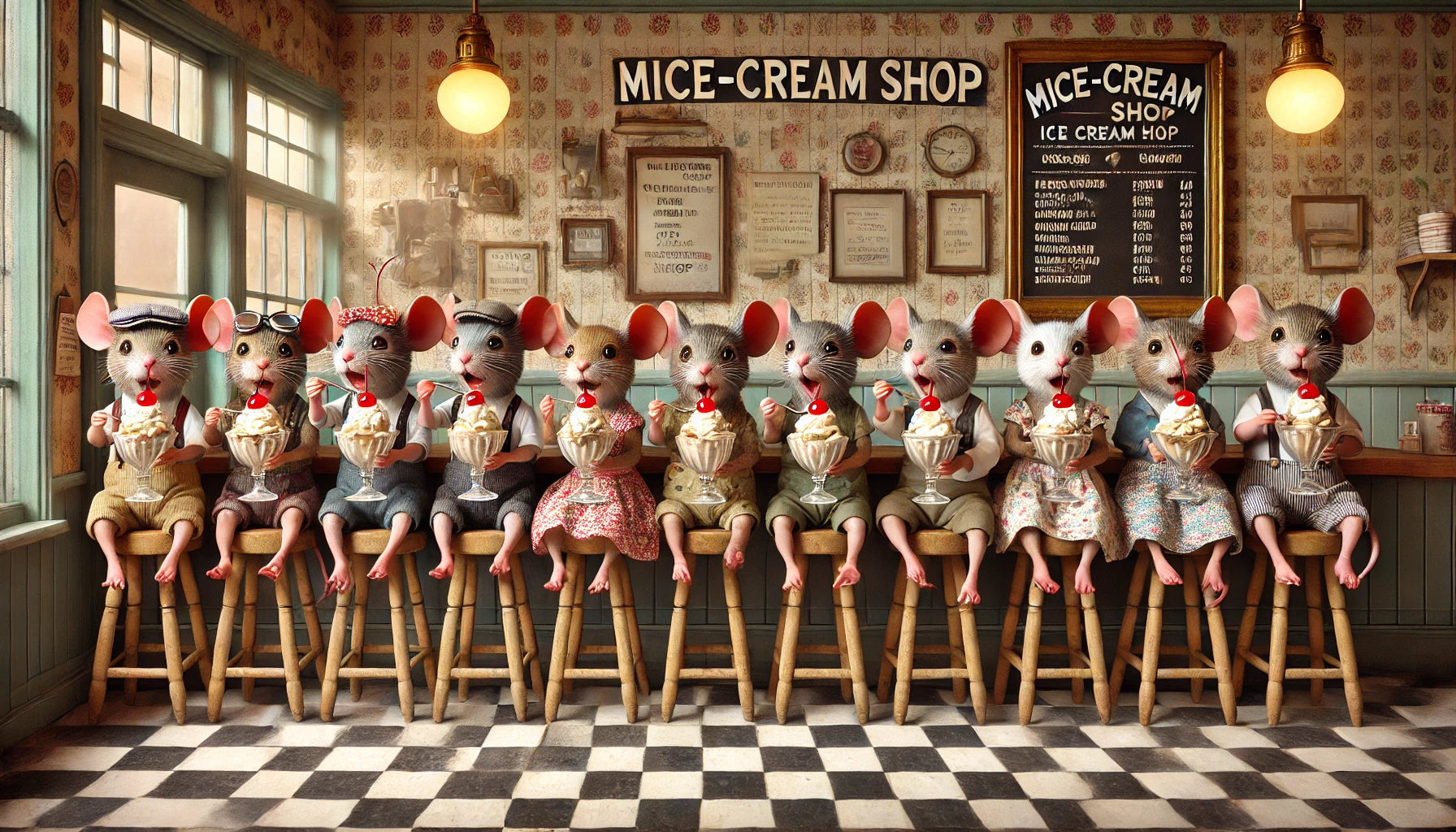 Whimsical “Mice-Cream” store with mice lined up. This matte print features a charming rustic ice cream stand run by tiny mice, with a cheerful line of mice waiting their turn for cones piled high with scoops. Painterly detail and storybook humor bring this playful pun to life. Perfect for whimsical animal art lovers, rustic kitchen décor, or as a unique gift for mouse and ice cream enthusiasts.