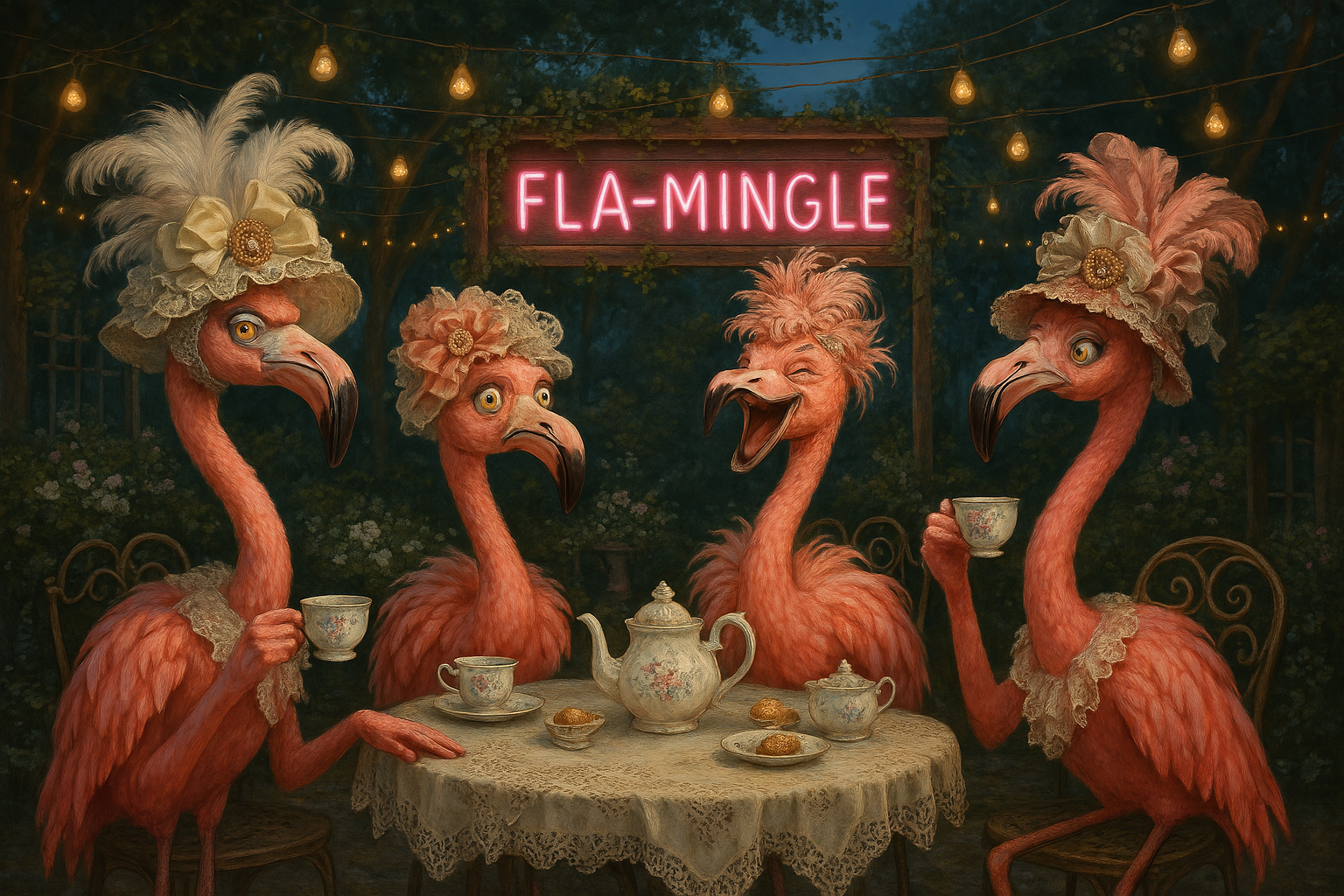 Whimsical flamingos having tea. This matte print features two elegant flamingos seated at a small vintage table, sipping tea from delicate cups with a teapot and pastries between them. Painterly detail and soft storybook charm create a playful yet refined scene. Perfect for whimsical animal art collectors, tea party décor, or as a unique gift for flamingo lovers.