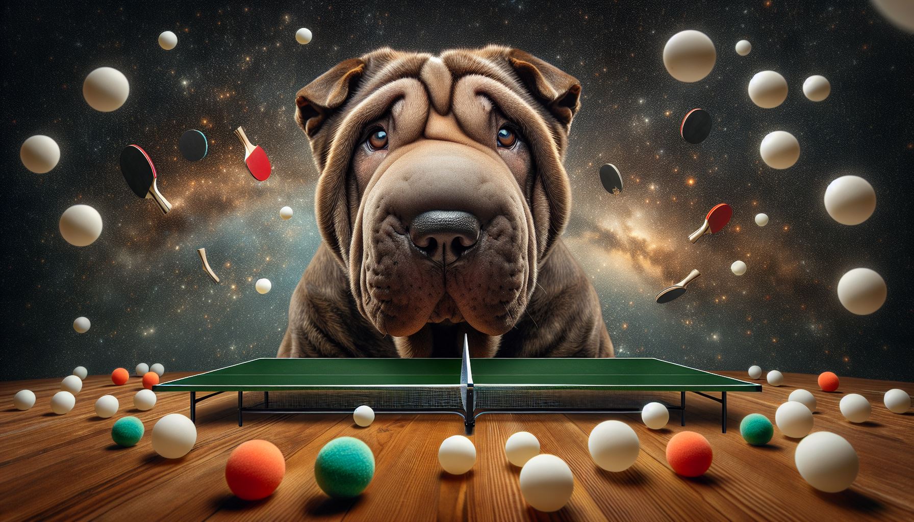 In a dramatic closeup, a Chinese Shar-Pei concentrates deeply at the ping pong table as balls swirl rapidly through the air around it. Its wrinkled brow tightens with focus, every muscle prepared for the next return as the bright table fades into painterly blur. The flying balls create a sense of speed and spectacle, blending humor, rustic detail, and Olympic spirit into one unforgettable performance. This artwork is available as a matte print.