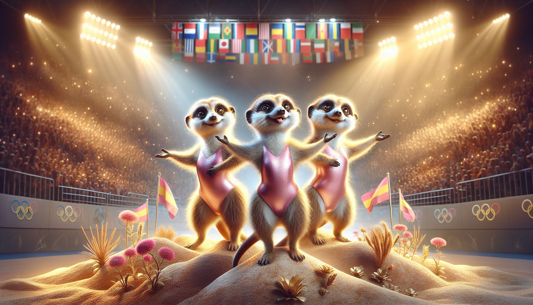Meerkat Olympic Medal-Winning Team Art Print – A whimsical matte print featuring a team of meerkats standing proudly on a pile of sand, waving joyfully to the cheering crowd after their medal-winning performance. Their upright postures, bright eyes, and triumphant gestures capture both cuteness and pride, while the stadium glows in the background. Painted in a painterly, whimsical, hyper-realistic style, this celebratory artwork blends the charm of meerkats with the energy of Olympic victory. Perfect for meerkat lovers, sports fans, and collectors of playful, uplifting animal art.