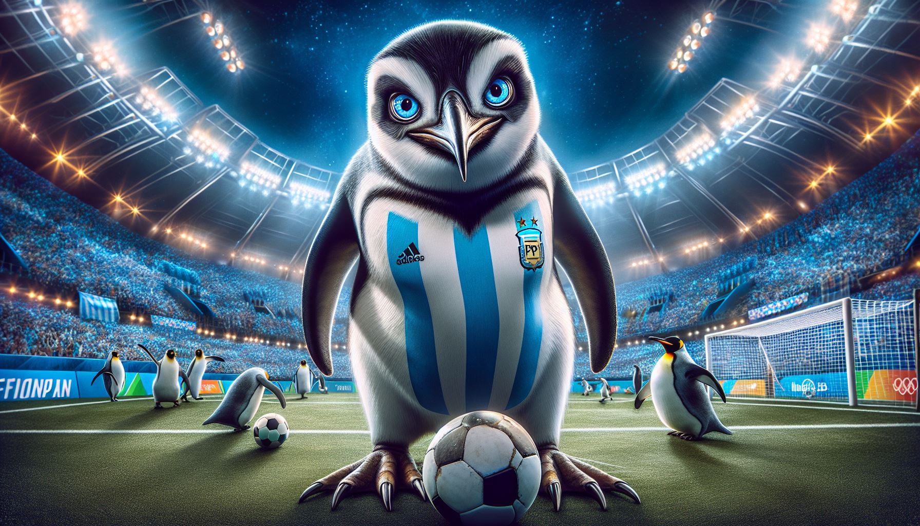 On the green field of a roaring Olympic stadium, a penguin stands proudly in Argentinian colors, a soccer ball resting near its feet. The bright lights shine down from above, casting painterly highlights across the bird’s sleek feathers as the blurred crowd waves flags in the background. With its determined stance and humorous charm, the penguin embodies both national pride and whimsical Olympic spirit. This artwork is available as a matte print.