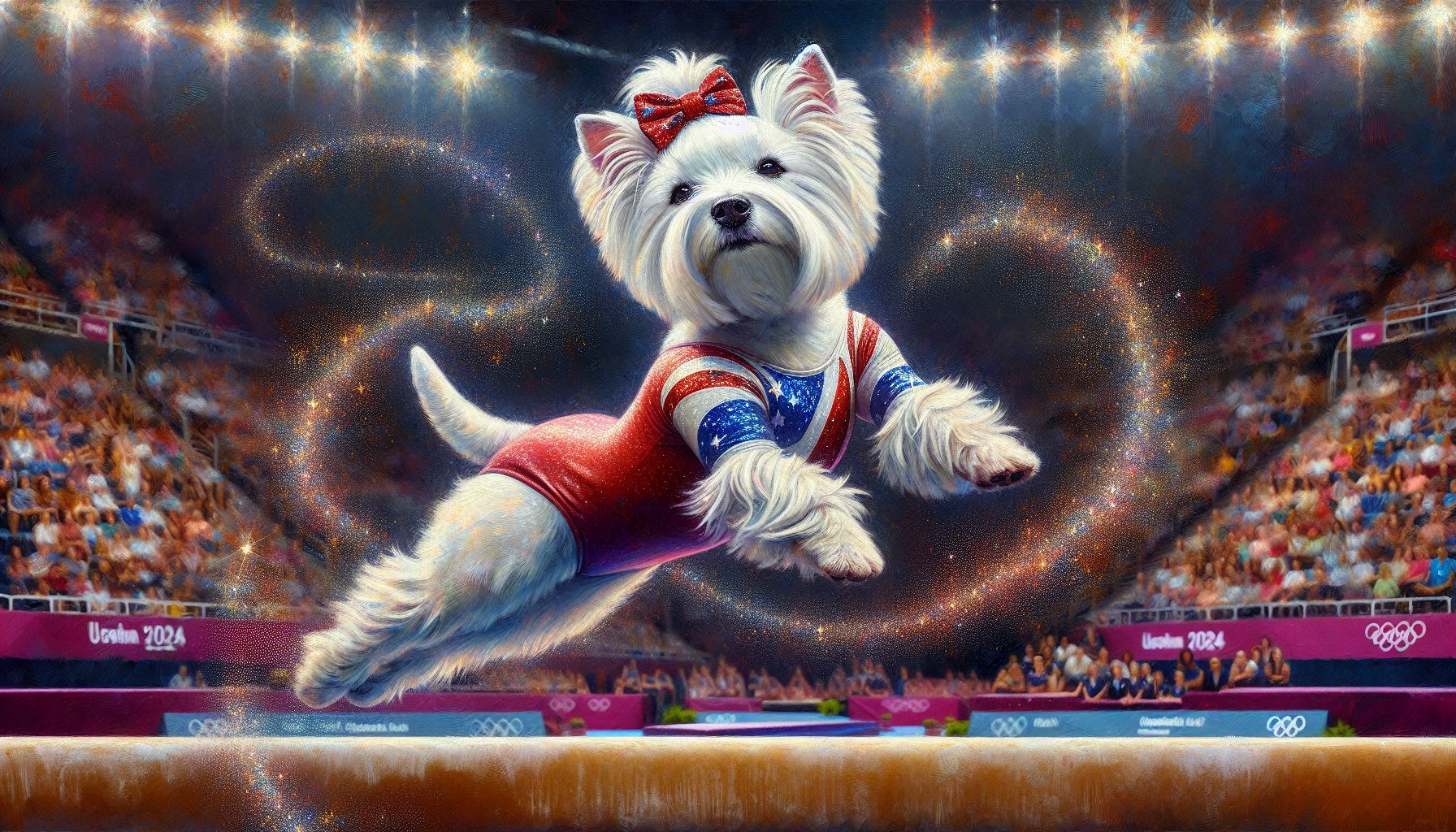 Westie Gymnastics Beam Art Print – A charming matte print featuring a West Highland White Terrier balancing gracefully on the gymnastics beam. With its fluffy white fur, perked ears, and determined little stance, the Westie looks both adorable and focused as it performs under the stadium lights. Painted in a painterly, whimsical, hyper-realistic style, this artwork captures the mix of cuteness and concentration that makes the Westie a star gymnast. Perfect for Westie lovers, gymnastics fans, and collectors of playful animal art.