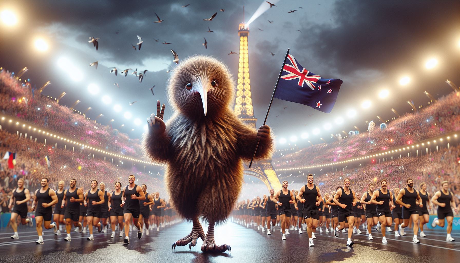 On the grand stage of the Olympic opening night, a proud kiwi bird strides confidently at the front of the New Zealand team, carrying the black-and-silver colors of its nation. The stadium glows with blazing lights and waving flags as athletes march in behind, the crowd erupting in cheers that blur into painterly color. The kiwi’s small but determined frame radiates pride, humor, and rustic charm, transforming this historic parade into a whimsical storybook moment of Olympic spirit. This artwork is available as a matte print.