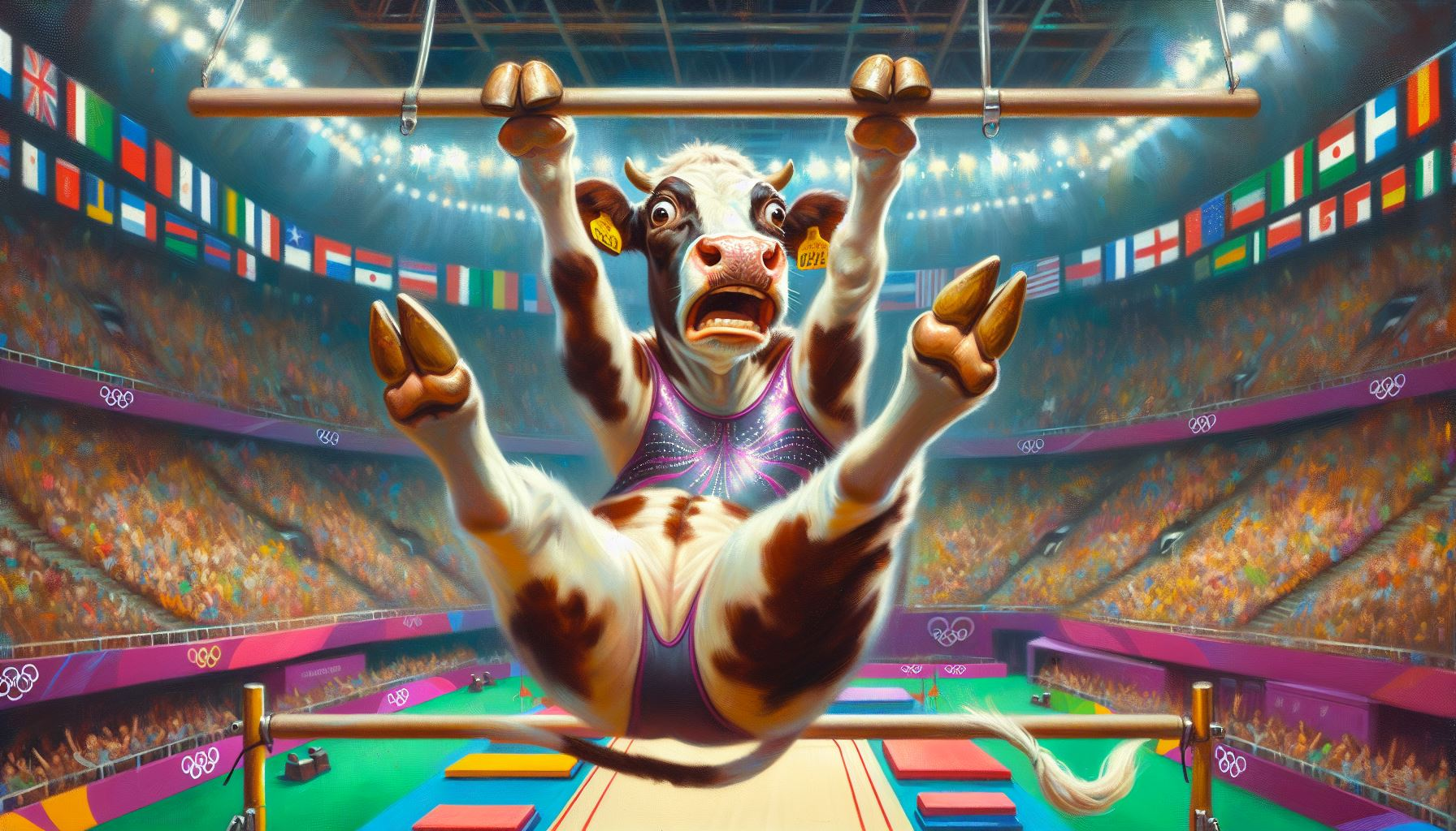 In the Olympic gymnastics arena, a cow swings wildly on the uneven bars, legs flailing in every direction as it struggles to keep control. The crowd gasps and laughs as the powerful animal twists and turns, hooves barely finding their grip on the bar. Painterly detail captures the flying motion, the rustic humor of the unlikely gymnast, and the drama of a performance teetering between disaster and brilliance. This artwork is available as a matte print.