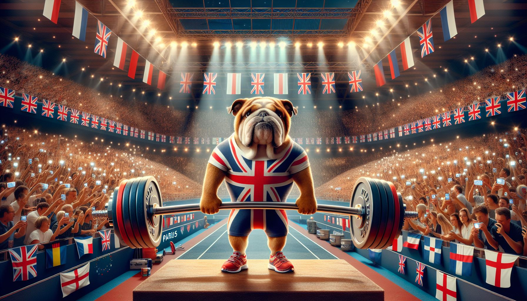 Inside the Olympic arena, an English Bulldog grips a massive barbell, muscles straining and eyes bulging with effort as it competes in the weightlifting event. Its stocky frame shakes under the load, yet determination shines through as the crowd cheers in painterly blur behind. Humor, rustic detail, and athletic grit combine to turn the unlikely athlete into a whimsical champion of strength and spirit. This artwork is available as a matte print.