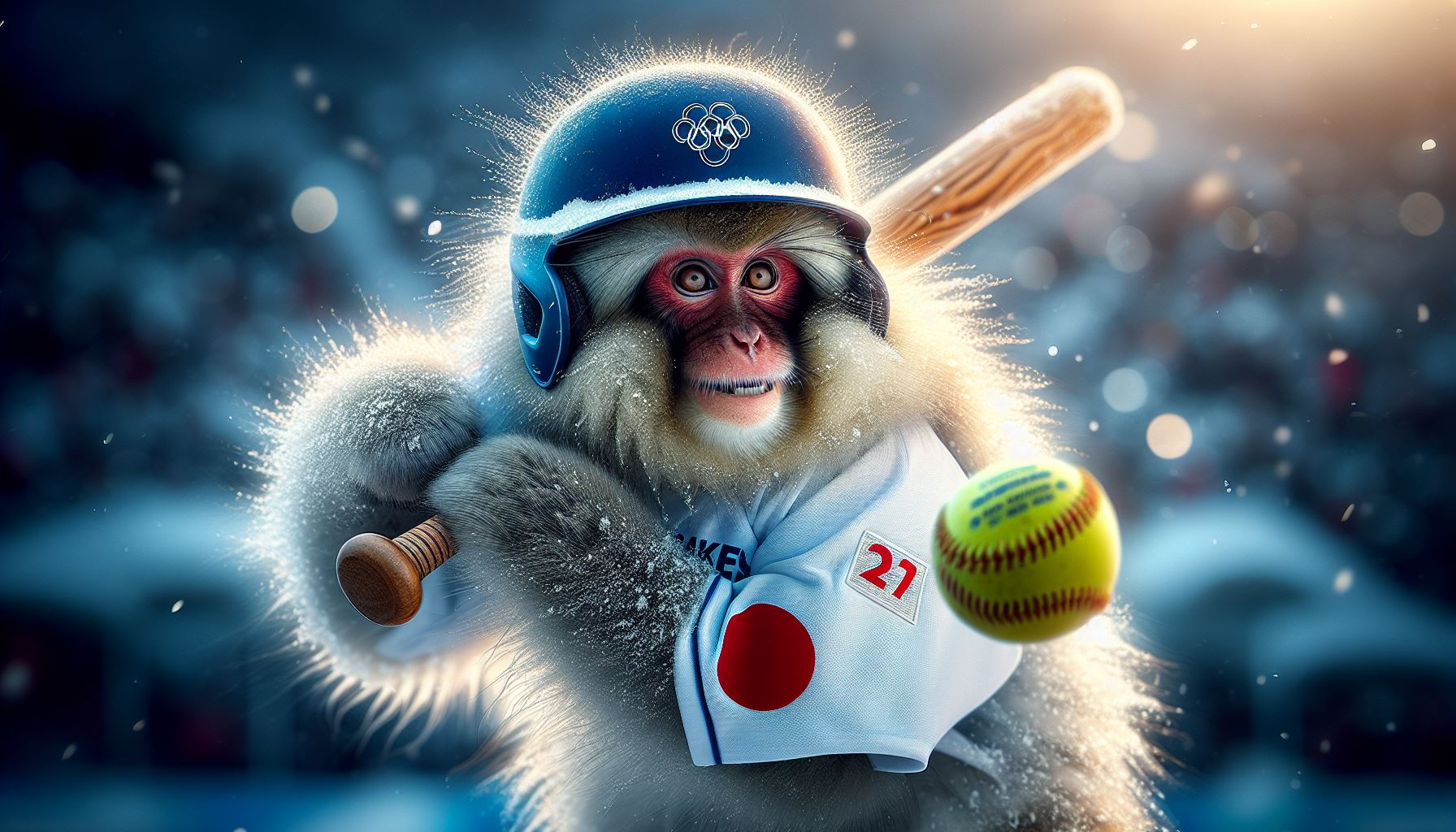 Japanese Macaque Olympic Softball Action Art Print – A thrilling matte print capturing a Japanese macaque mid-swing on the softball field. The bat cuts through the air as dust rises from the ground, stadium lights blazing overhead and the crowd roaring in the background. With its agile body in motion and fierce expression locked on the ball, the macaque embodies determination, speed, and Olympic spirit. Painted in a painterly, whimsical, hyper-realistic style, this action-packed artwork blends Japanese wildlife with the excitement of Olympic sport. Perfect for monkey lovers, sports enthusiasts, and collectors of dynamic whimsical animal art.
