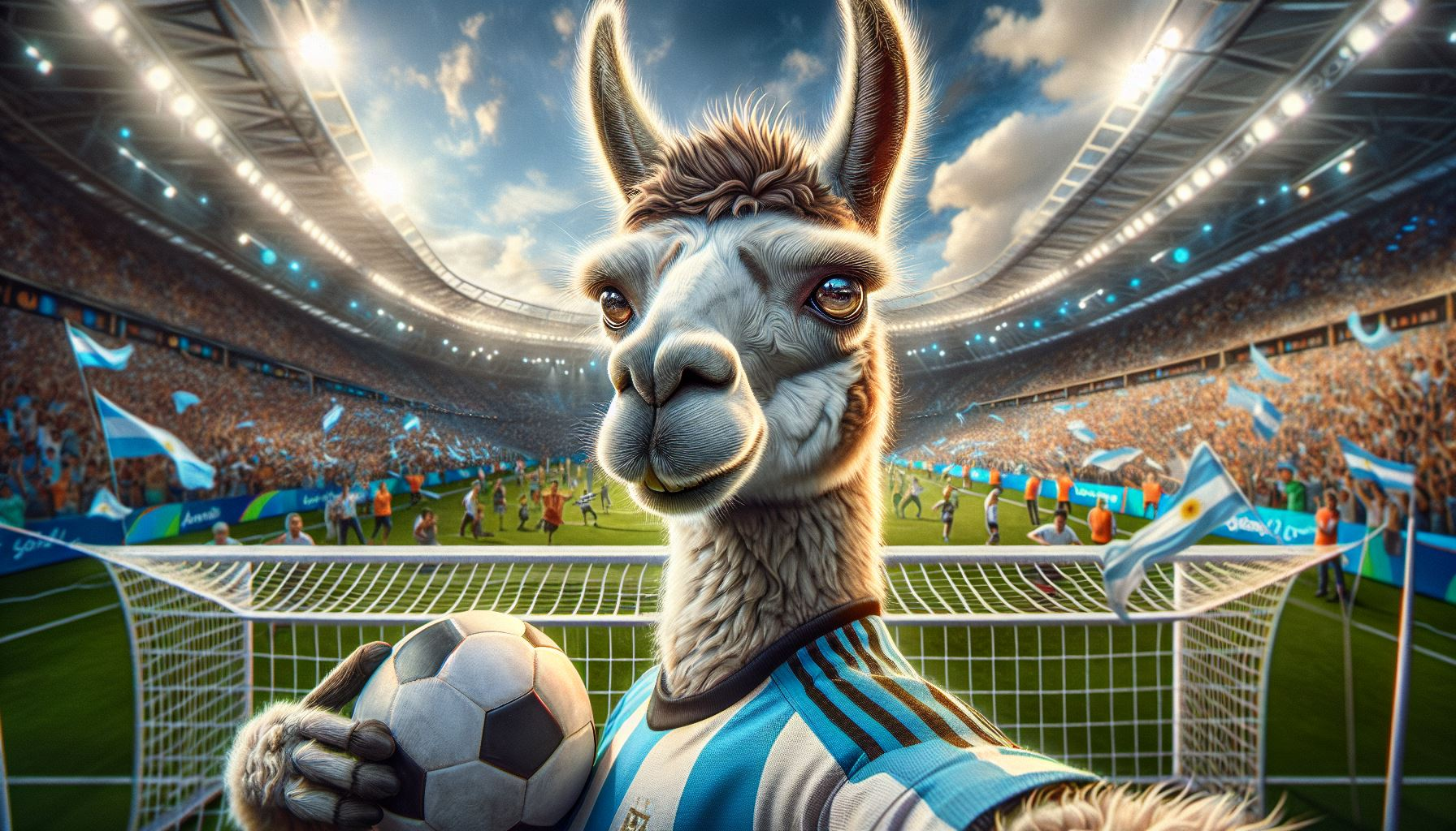 Argentinian Llama Olympic Soccer Selfie Art Print – A whimsical matte print featuring a llama dressed proudly in Argentina’s sky-blue and white colors, holding up a phone to snap a selfie on the soccer pitch. The stadium glows with bright lights as the llama beams with confidence, blending South American spirit with Olympic soccer energy. Painted in a painterly, hyper-realistic, and humorous style, this playful artwork captures the joy of sport and the quirky charm of a llama showing off its fandom. Perfect for llama lovers, soccer fans, and collectors of imaginative Olympic animal art.
