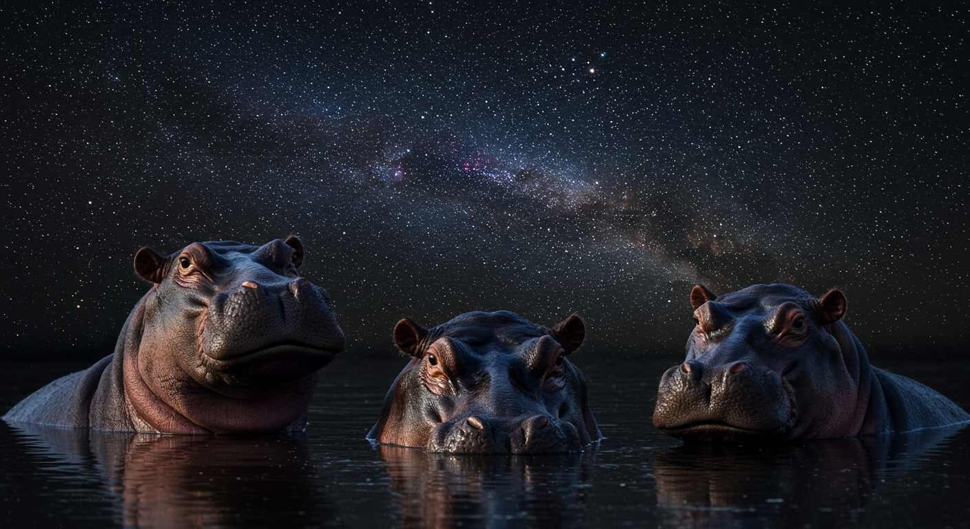 Three hippos resting in the waterhole beneath a dark, starry sky, their round forms mirrored in the still reflection under moonlight. This matte print captures the calm presence of hippos enjoying the quiet of night in painterly, hyper-detailed storybook style. With its serene and atmospheric mood, the artwork celebrates the beauty of African wildlife after dark. Perfect for hippo lovers, collectors of African art, or anyone seeking striking nocturnal décor.