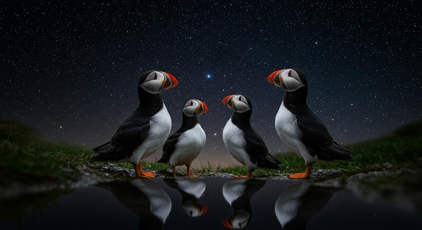 A group of puffins gathered at the edge of a waterhole beneath a starry night sky, their round forms mirrored in the moonlit surface. This matte print blends the whimsy of puffins with the quiet stillness of night, painted in a painterly, hyper-detailed storybook style. With its calm, reflective atmosphere, the artwork captures the charm of puffins in an unexpected nocturnal setting. Perfect for puffin lovers, bird art collectors, or anyone seeking unique nighttime décor.