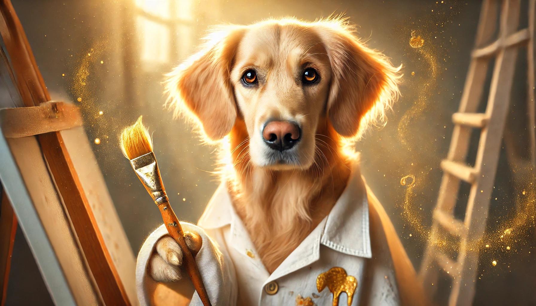 Whimsical Golden Retriever close-up holding a paintbrush in a white studio with golden sunbeams. This matte print captures a playful artistic moment — a Golden Retriever gazing brightly at the viewer, brush held proudly as soft golden light streams across the white-walled studio. Painted in painterly, storybook style, the image blends humor, charm, and creativity, making it a delightful piece for whimsical animal art collectors, Golden Retriever lovers, or art enthusiasts.