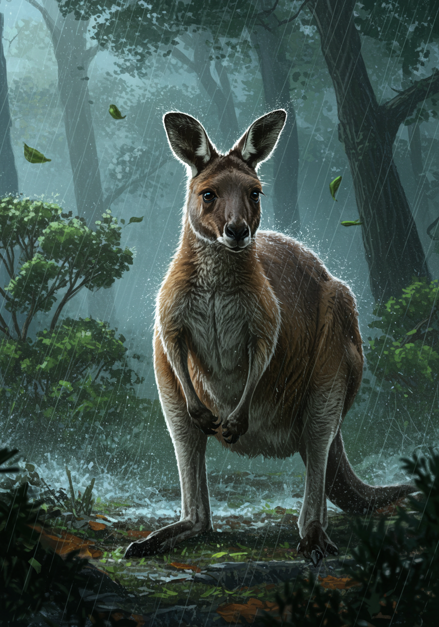 Realistic kangaroo standing in heavy rain, its soaked fur clinging as wind sweeps across the wilderness. Without lightning, the scene focuses on the quiet intensity of the downpour—grey skies, falling rain, and the animal’s powerful form enduring the storm. This vertical matte print is painted in a painterly, hyper-detailed storybook style, blending rustic mood with dramatic atmosphere. A bold and striking piece for animal lovers, storm enthusiasts, or collectors of moody wildlife art.