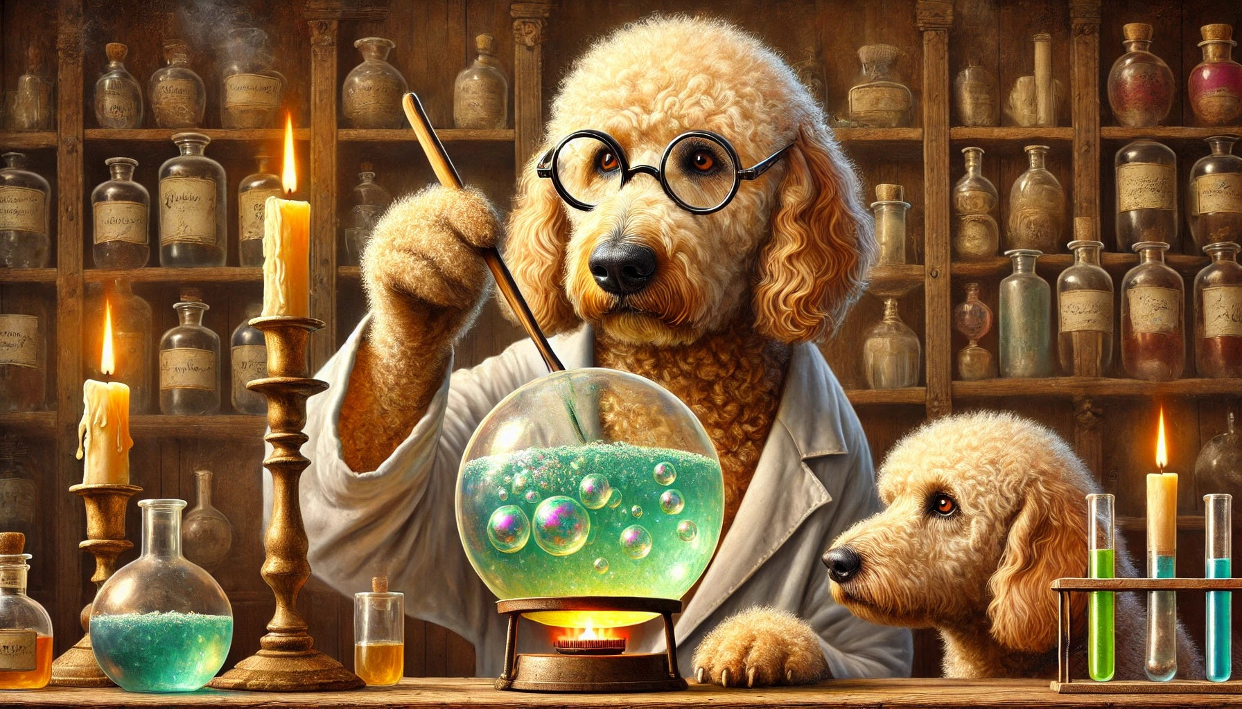 Whimsical Goldendoodle art print featuring a dramatic laboratory scene with a curious puppy. This matte finish artwork shows the Goldendoodle in a white lab coat, deeply focused on a glowing beaker experiment, while a small puppy peers over the table with wide-eyed fascination. Painterly textures and rustic storybook tones highlight the contrast between the serious scientist and the eager observer, blending humor and charm with an atmosphere of discovery. Perfect for dog lovers, science enthusiasts, or collectors of playful and imaginative animal artwork.