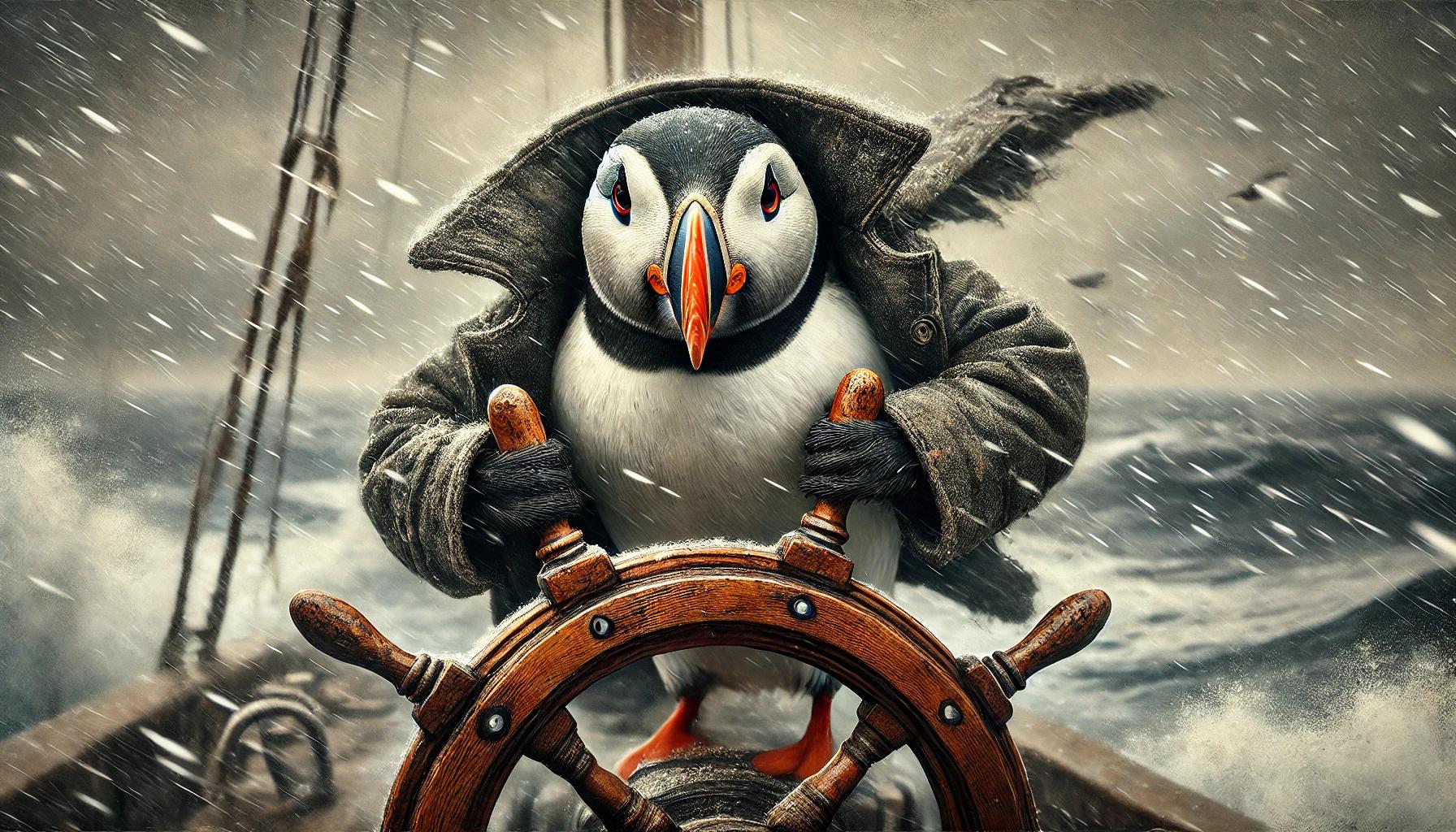 Whimsical puffin steering an old-fashioned ship through stormy seas. This matte print captures a daring maritime moment — a puffin gripping the great wooden wheel with fierce determination as rain lashes the deck and storm clouds churn overhead. Painted in painterly, storybook style, the image blends nautical drama with whimsical charm, making it a striking piece for whimsical animal art collectors, puffin lovers, or nautical décor enthusiasts.
