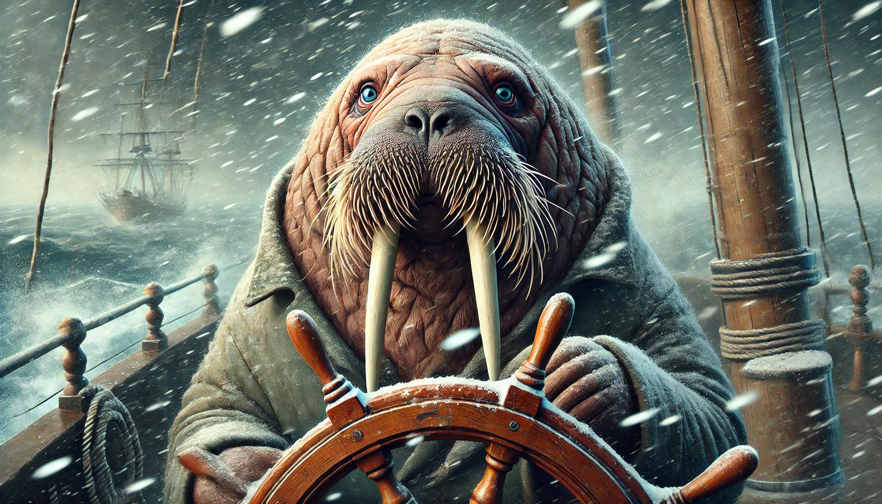 Brave walrus steering an old-fashioned ship through stormy seas. This matte print captures a bold maritime adventure — a massive walrus gripping the great wooden wheel, tusks gleaming as sea spray crashes over the deck beneath storm-dark skies. Painted in painterly, storybook style, the image blends nautical grit with whimsical charm, making it a striking piece for whimsical animal art collectors, walrus lovers, or nautical décor enthusiasts.