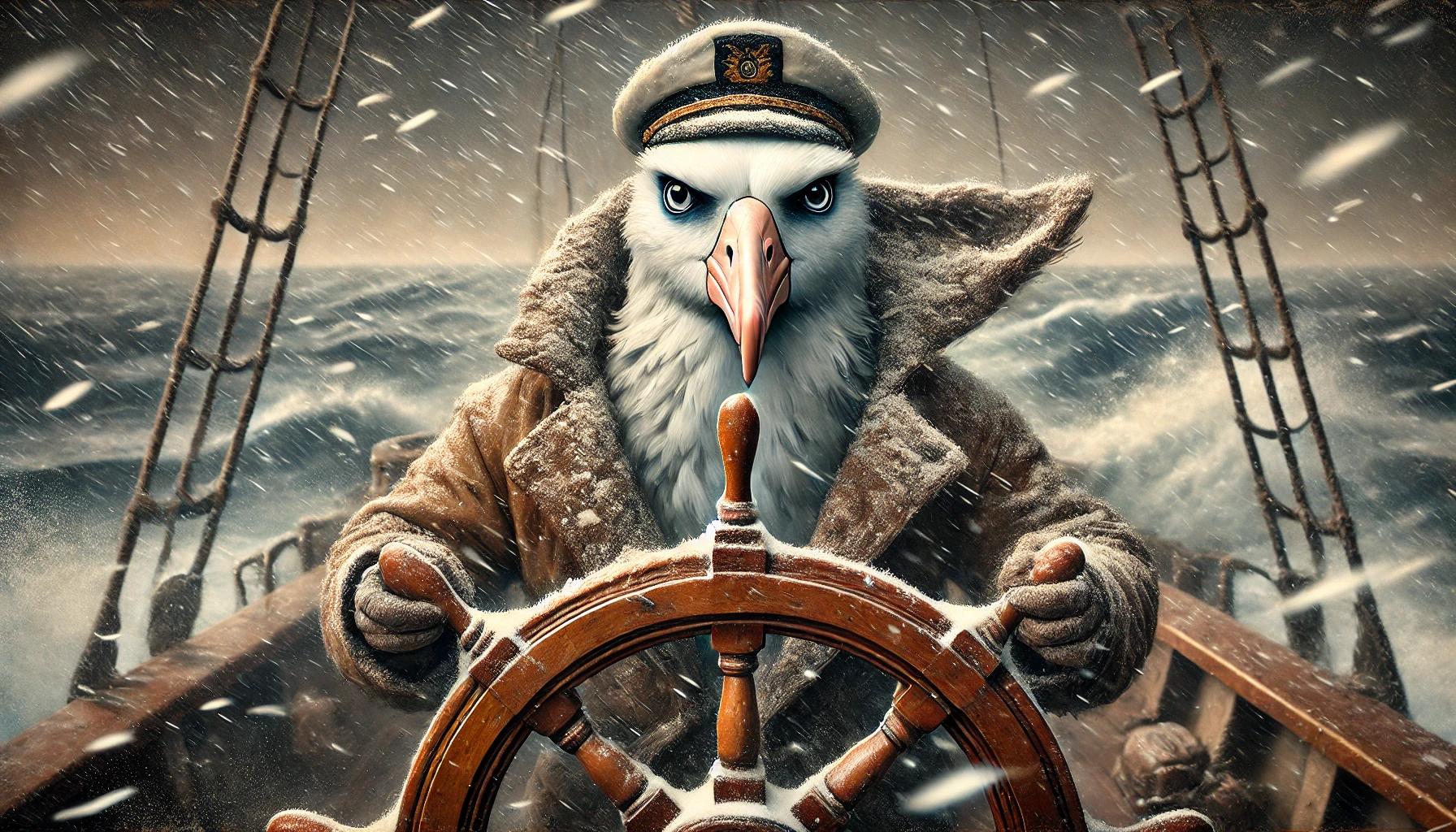 Whimsical albatross steering an old-fashioned ship through stormy seas. This matte print captures a powerful maritime moment — a brave albatross gripping the ship’s wooden wheel with determined eyes as rain lashes the deck and waves crash against the hull. Painted in painterly, storybook style, the image blends nautical drama with whimsical adventure, making it a striking piece for whimsical animal art collectors, bird lovers, or nautical décor enthusiasts.