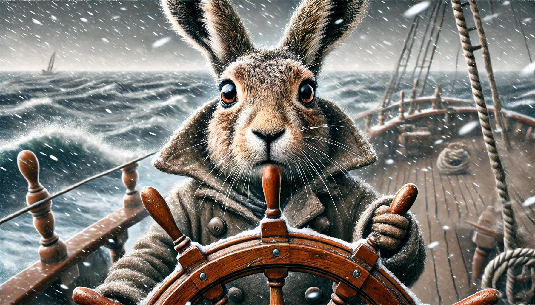 Hare steering an old-fashioned ship through stormy seas. This matte print captures a dramatic nautical adventure — a determined hare bracing against the wind and rain as it grips the great wooden wheel of a storm-tossed vessel. Painted in painterly, storybook style, the image blends rustic grit with whimsical bravery, making it a striking piece for whimsical animal art collectors, hare lovers, or nautical décor enthusiasts.