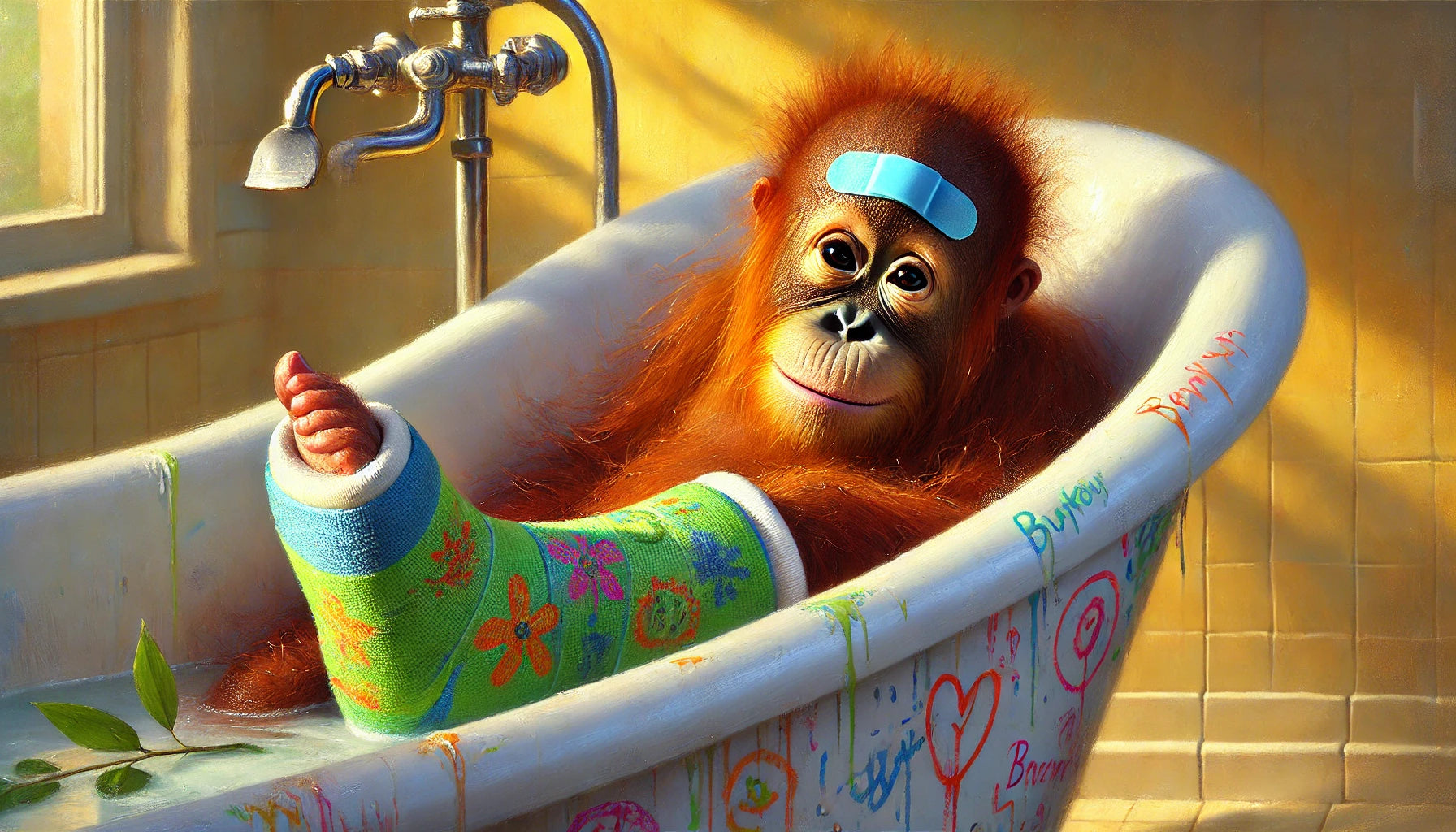 Whimsical baby orangutan art print featuring a tender hospital scene. This matte finish artwork captures the young orangutan resting under a blanket, its wide eyes full of expression. Painterly detail and rustic, storybook textures bring warmth and gentle humor, turning a poorly moment into a heartwarming scene. Perfect for whimsical décor, primate lovers, or collectors of playful and comforting artwork.