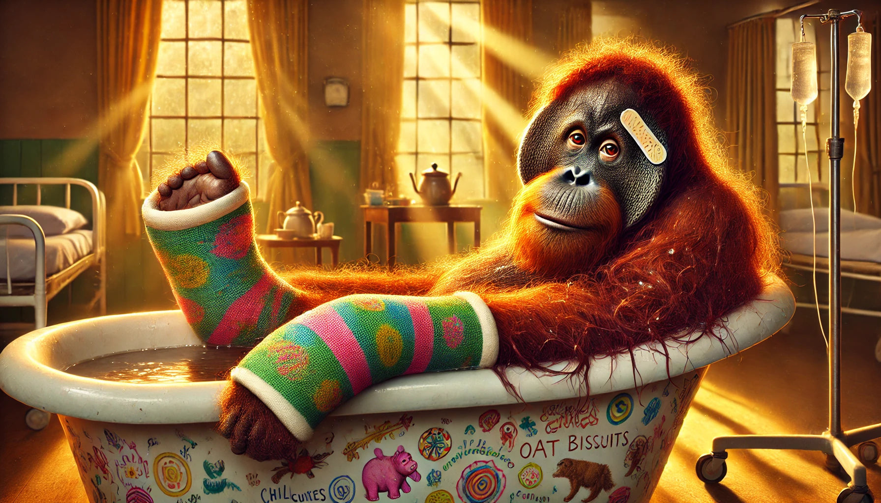 Whimsical adult orangutan art print featuring a rustic hospital-inspired scene. This matte finish artwork captures the orangutan resting with a bandaged arm and foot, its wise eyes and gentle posture rendered in painterly detail. Rustic storybook textures soften its powerful frame, blending humor and tenderness to create a heartfelt “feeling poorly” moment. Perfect for whimsical décor, primate lovers, or collectors of expressive and comforting artwork.