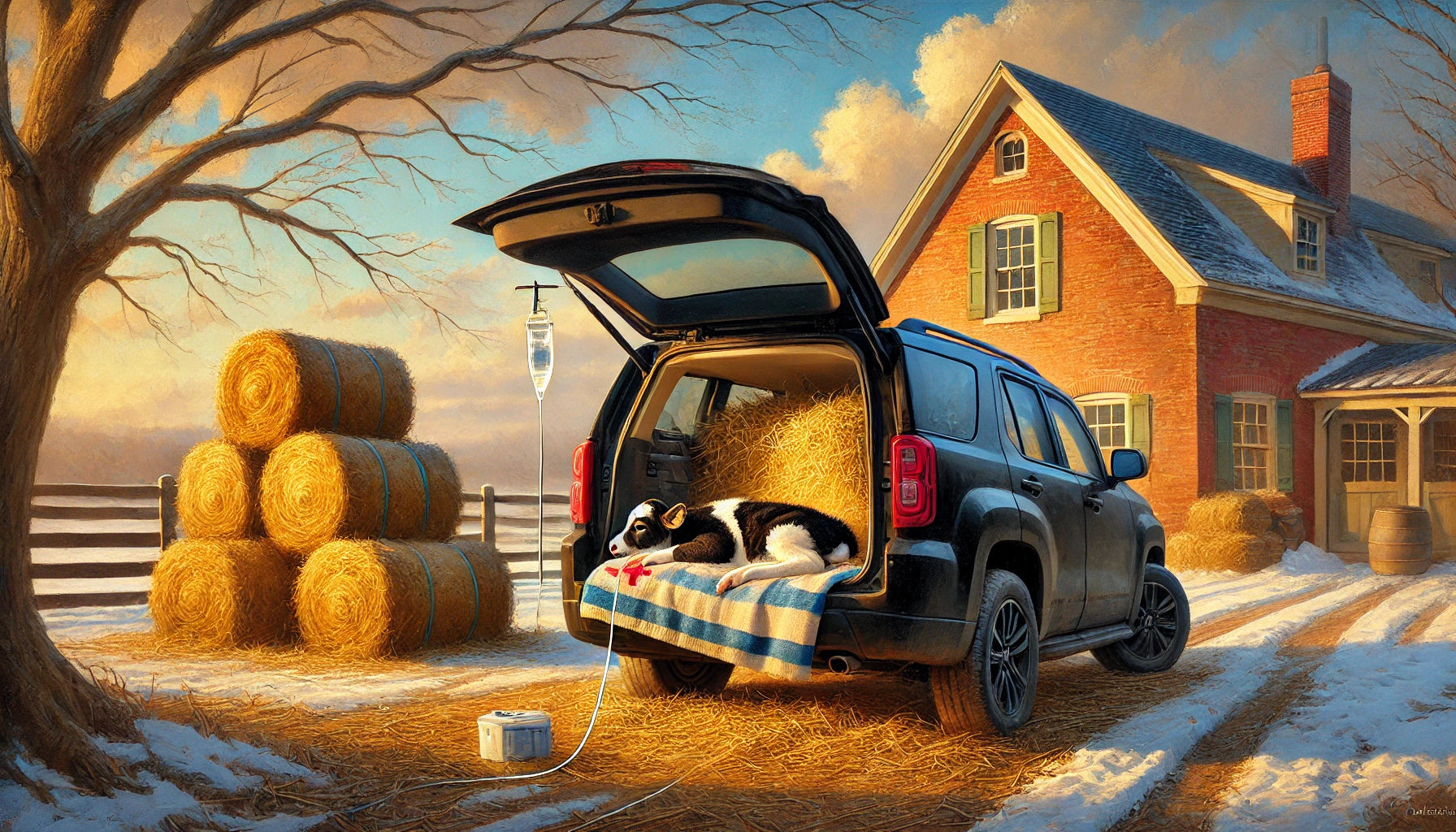 Whimsical calf art print capturing a rustic farm hospital moment. This matte finish artwork shows a young calf resting in the open trunk of an SUV, cozy and calm as a drip hook-up helps it feel better. Painterly textures and warm, storybook tones bring tenderness and charm to the scene, blending rural life with gentle care. Perfect for farm animal lovers, rustic décor, or collectors of heartfelt whimsical art.