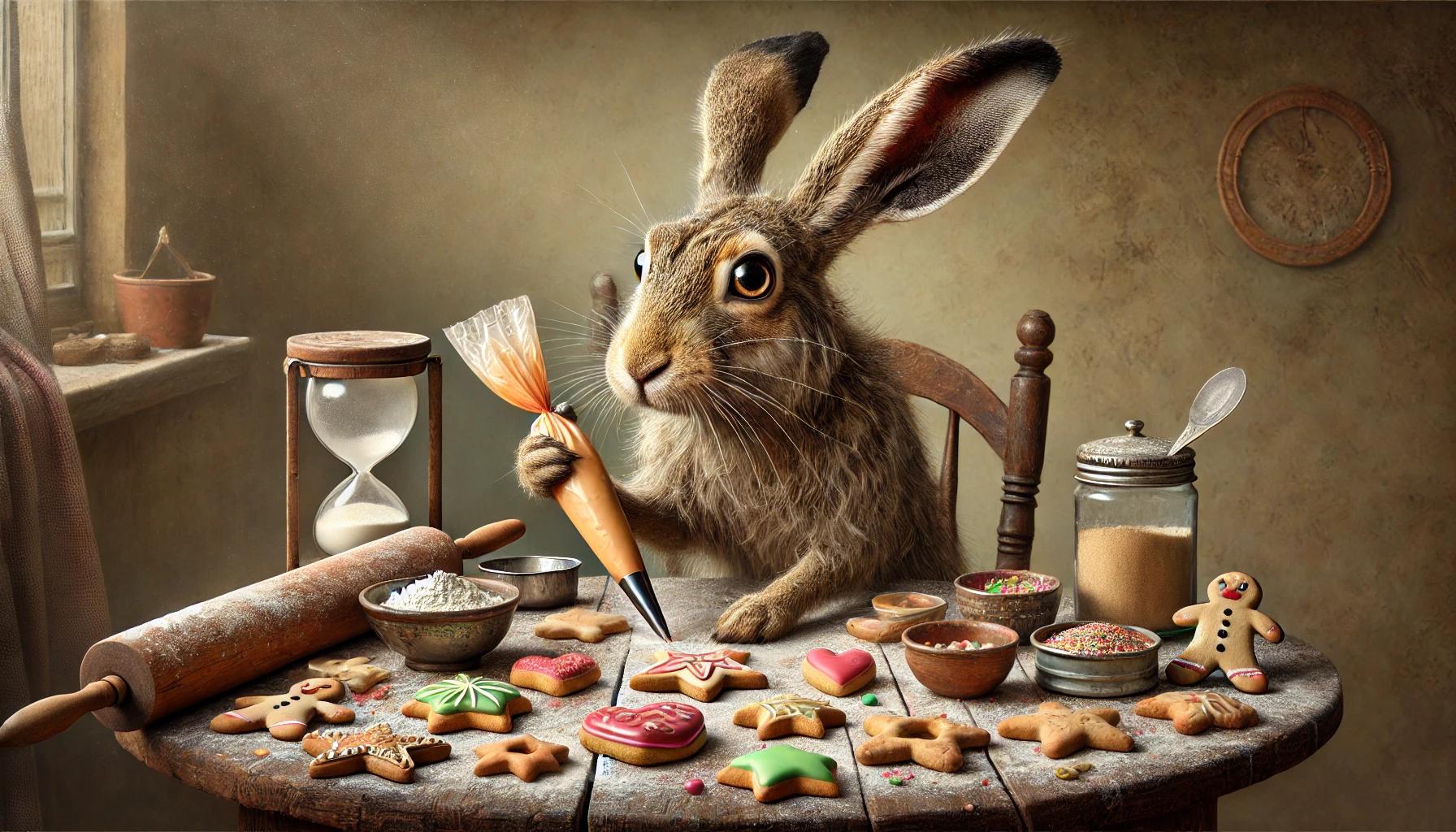 Whimsical hare in a rustic kitchen with neutral stone walls. This matte print captures a cozy storybook moment — a hare standing at a wooden table decorating cookies. Painted in painterly, storybook style, the image blends cottage warmth with whimsical charm, making it a delightful piece for whimsical animal art collectors, hare lovers, or rustic kitchen décor enthusiasts.