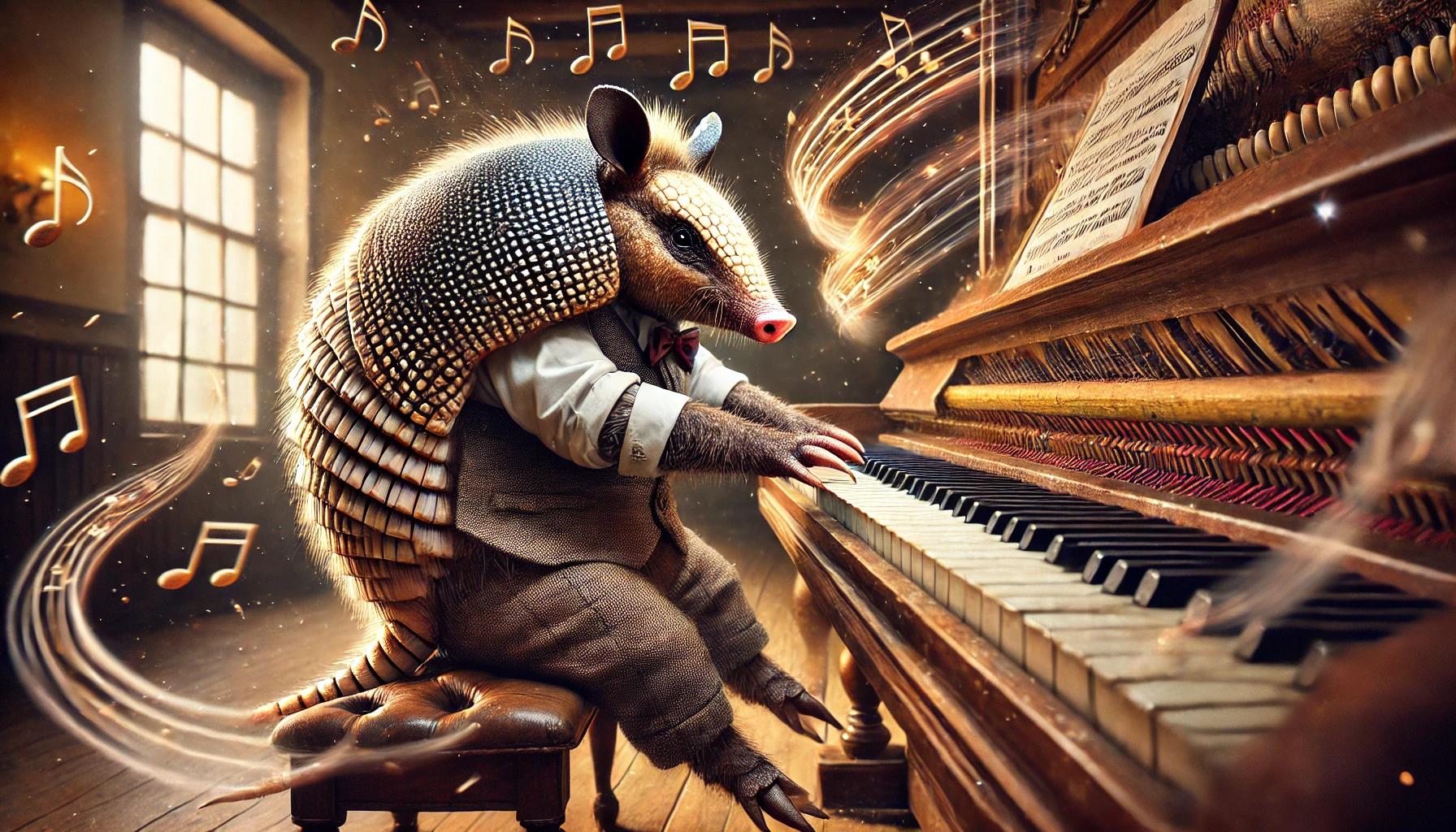 Dramatic armadillo musician art print with painterly textures and moody stage lighting. This matte finish artwork captures the armadillo in a powerful performance moment, its plated armor glinting under theatrical highlights as musical notes swirl in the air. The scene emphasizes drama and presence, turning an unexpected subject into a bold, expressive piece of story-rich art. Perfect for music lovers, collectors of unique animal art, or anyone drawn to dramatic and imaginative imagery.