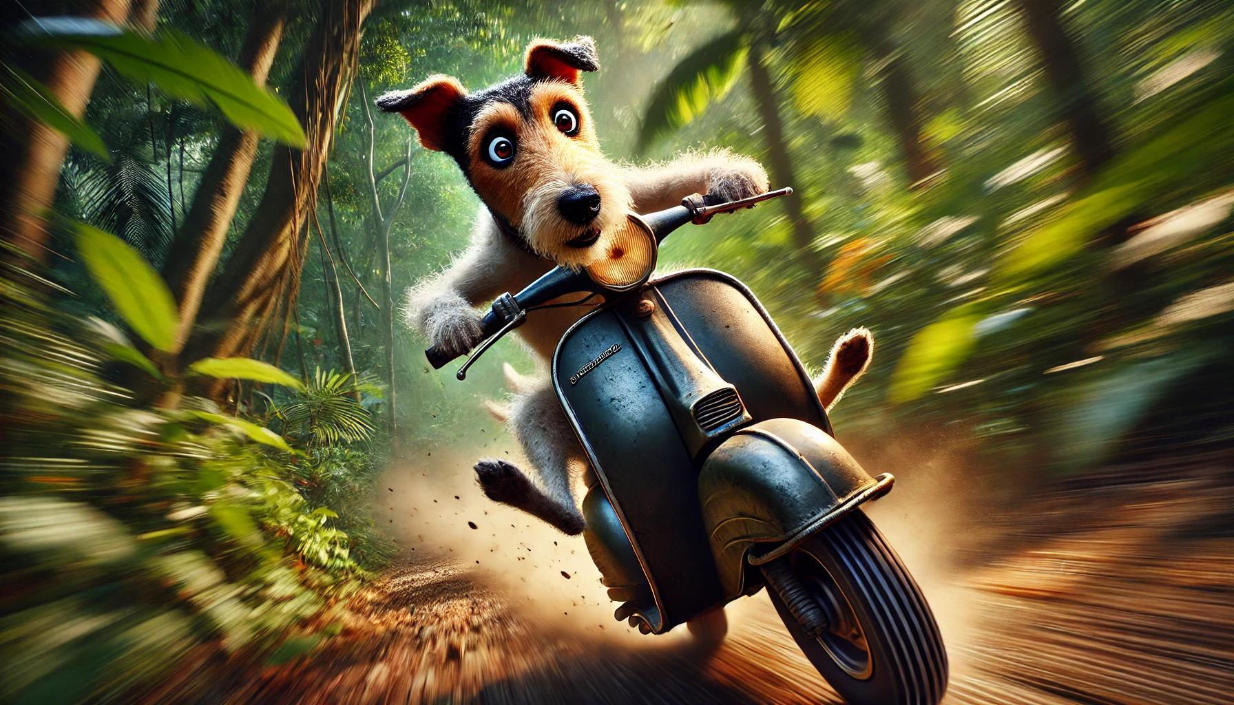 Whimsical fox terrier riding a motorcycle. This matte print features a lively fox terrier captured in painterly storybook style, gripping the handlebars of a vintage motorbike with ears flying back in the wind. Perfect for whimsical animal art collectors, rustic home décor lovers, or as a unique gift for dog and terrier enthusiasts.