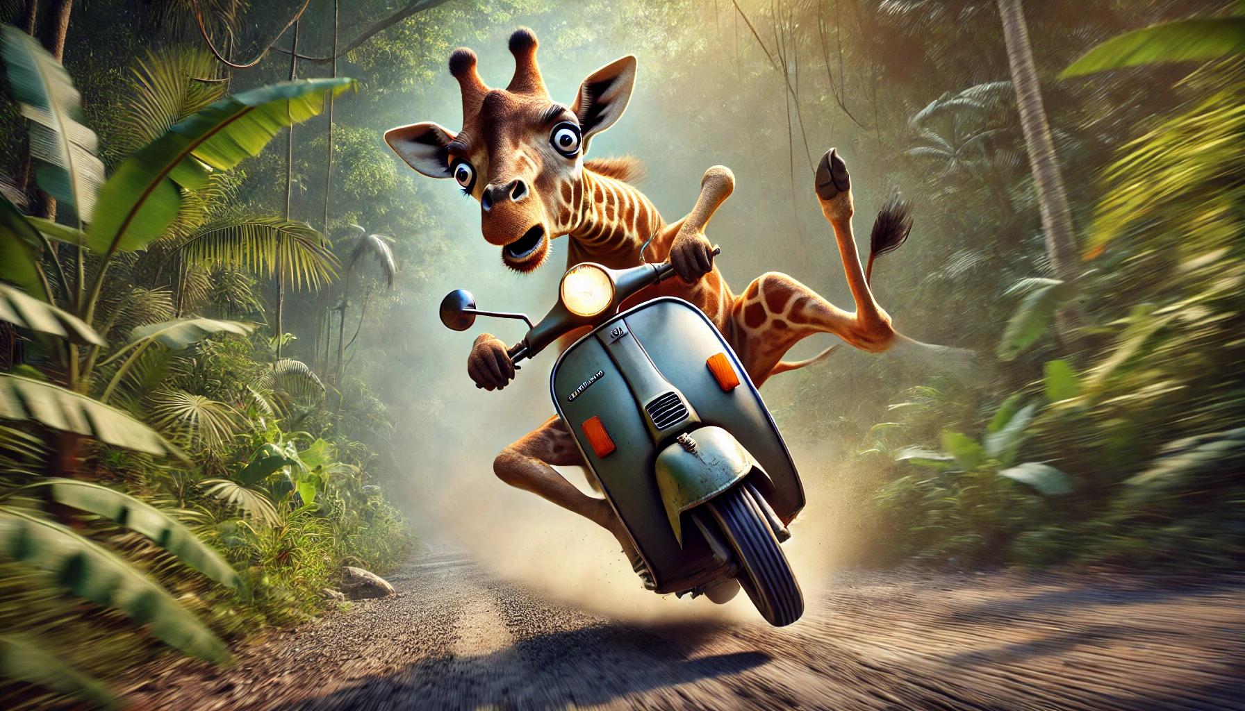 Whimsical giraffe riding a motorcycle. This matte print features a tall, lifelike giraffe captured in painterly storybook style, gripping the handlebars of a vintage motorbike with its long neck stretching high above the trees as it speeds down a jungle path. Perfect for whimsical animal art collectors, safari décor lovers, or as a unique gift for giraffe and wildlife enthusiasts.