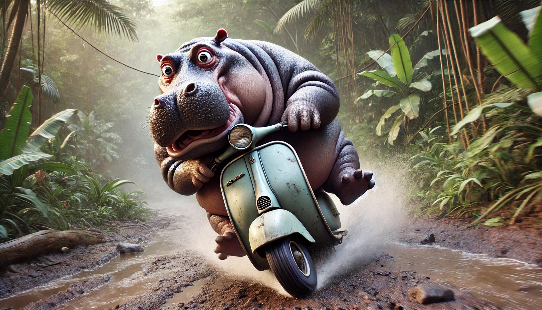 Whimsical hippo riding a motorcycle. This matte print features a lively hippopotamus captured in painterly storybook style, gripping the handlebars of a sturdy vintage motorbike as it barrels down a jungle path with a wide, toothy grin. Perfect for whimsical animal art collectors, safari décor lovers, or as a unique gift for hippo and wildlife enthusiasts.