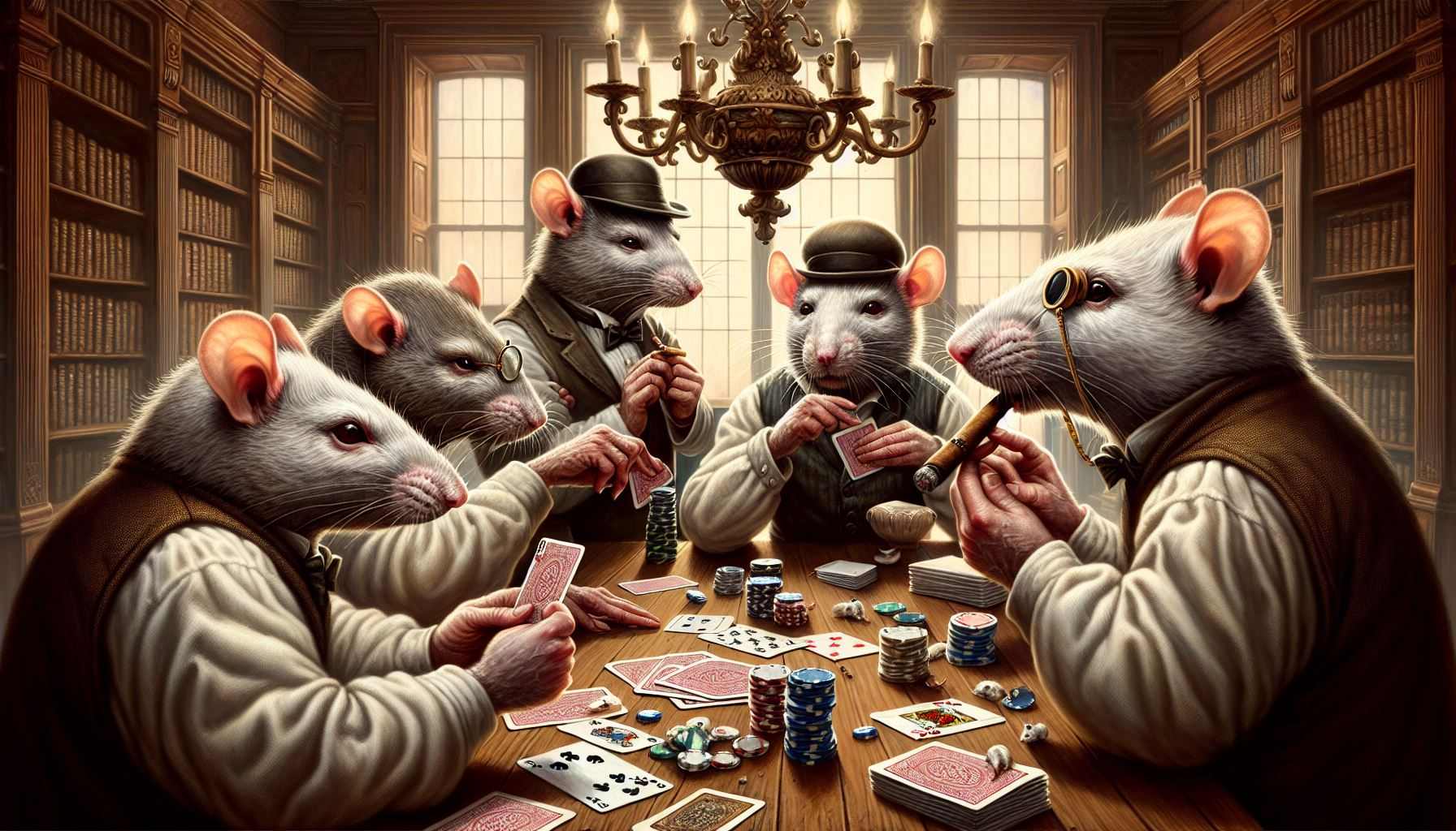 Realistic rats seated at a poker table in a darkened room, lit by the warm glow of a single lamp. This matte print captures the gritty charm of a late-night card game, reimagined with painterly, rustic storybook detail. With expressive faces, dramatic shadows, and whimsical atmosphere, this artwork is perfect for poker enthusiasts, animal art collectors, or anyone seeking unique rustic décor with a playful twist.