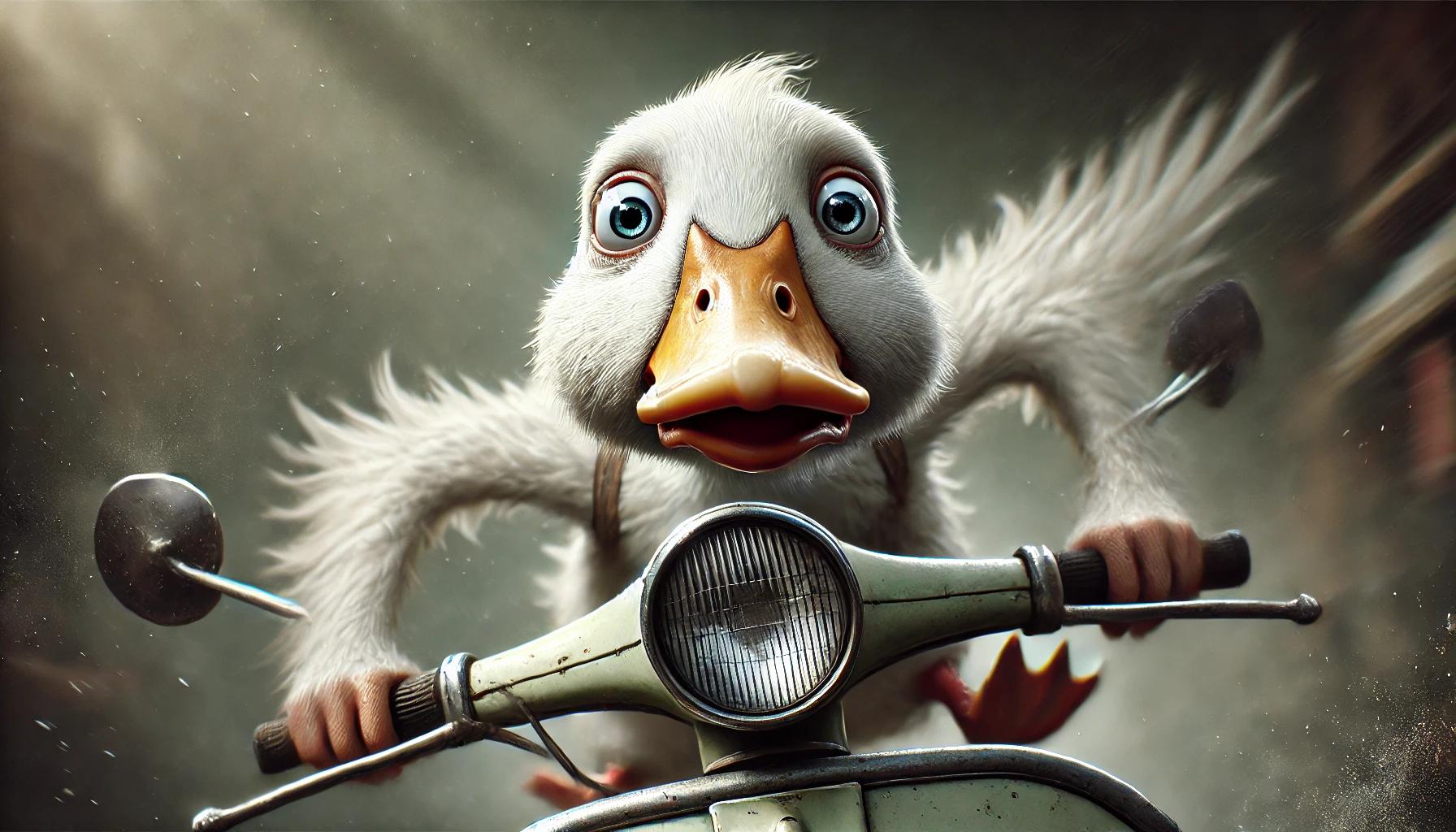 Whimsical white duck racing through a forest on a scooter. This matte print features a lively duck speeding along a leafy woodland path, feathers ruffled in motion as the scooter wheels kick up leaves. Painterly storybook detail captures both humor and energy, blending rustic charm with playful adventure. Perfect for whimsical animal art lovers, quirky home décor, or as a unique gift for duck and bird enthusiasts.