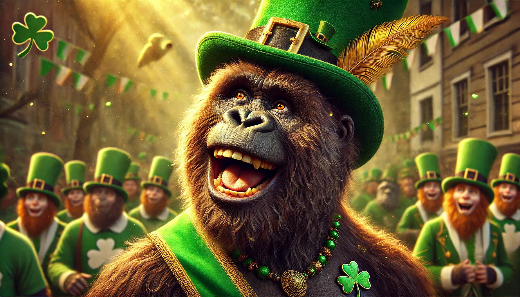 Whimsical gorilla in a St. Patrick’s Day parade. This matte print features a lifelike gorilla dressed in rustic festive attire, wearing a bright green hat and shamrock decorations while marching proudly through the parade. Painterly storybook detail captures the humor, energy, and celebration of the holiday. Perfect for whimsical animal art lovers, holiday décor collectors, or as a unique gift for gorilla and primate enthusiasts.