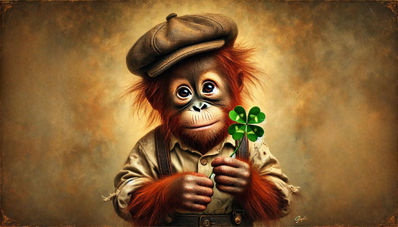 Whimsical baby orangutan holding a clover. This matte print features an adorable young orangutan seated in a rustic jungle setting, gently holding a bright green clover with wide, curious eyes. Painterly storybook detail captures both innocence and charm. Perfect for whimsical animal art lovers, nursery décor, St. Patrick’s Day displays, or as a unique gift for orangutan and primate enthusiasts.
