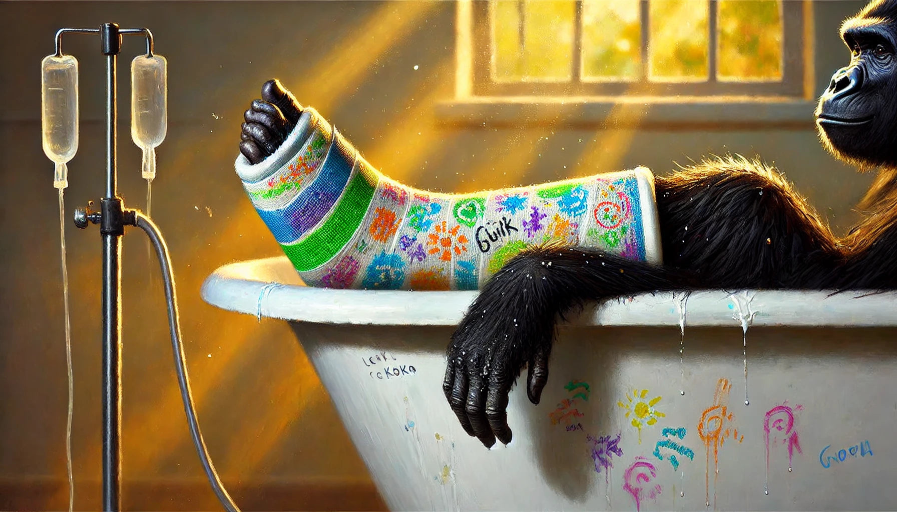 Whimsical gorilla taking a bath in a hospital setting. This matte print features a weary gorilla soaking in a warm tub, one leg lifted with a white cast resting on the side. Subtle hospital details—like clean tiles, linens, and soft lighting—add gentle humor to the painterly storybook scene. Perfect for whimsical animal art lovers, rustic décor fans, or as a unique gift for gorilla and primate enthusiasts.