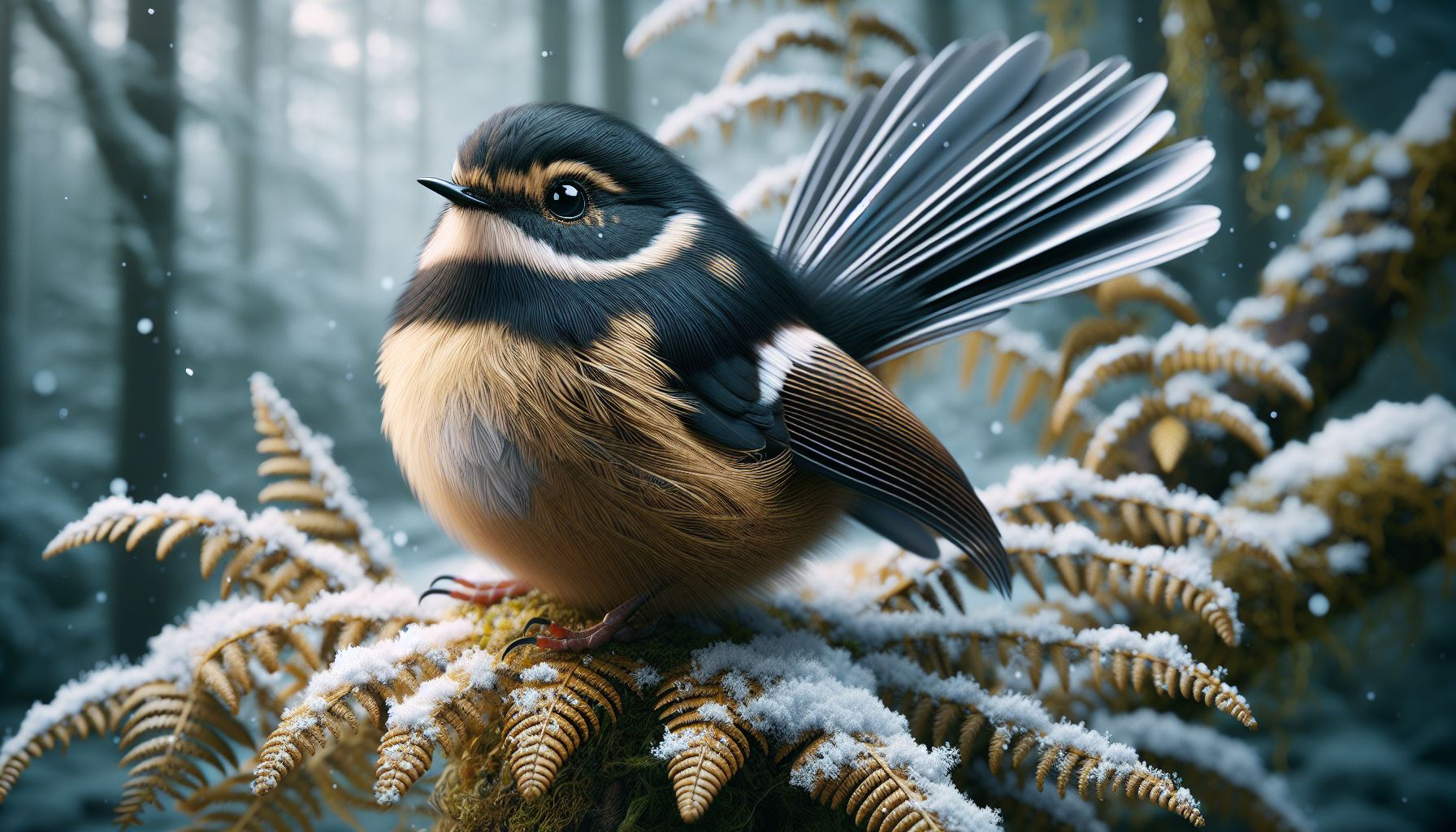 Stunning New Zealand Bird art print featuring the Fantail (Pīwakawaka) in a serene winter forest scene. The Bird perches lightly on a frost-covered branch, its delicate fan-shaped tail spread as soft snowflakes drift through the air. The muted tones of the forest, with snow-dusted ferns and quiet stillness, create a high-quality artwork that captures the wonderland beauty of Aotearoa in winter. Perfect for Bird lovers, art collectors, or anyone inspired by the seasonal landscapes of New Zealand.