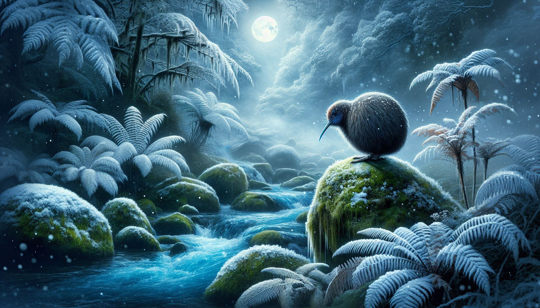 Stunning New Zealand Bird art print featuring a Kiwi perched on a moss-covered rock as snow falls gently around it. The Bird’s rounded form is dusted with flakes while ferns and mossy branches glisten under a light layer of white. The muted winter tones create a high-quality artwork that blends the resilience of Aotearoa’s national Bird with the still beauty of a snow-covered forest. Perfect for Bird lovers, art collectors, or anyone inspired by the seasonal wonder of New Zealand’s landscapes.