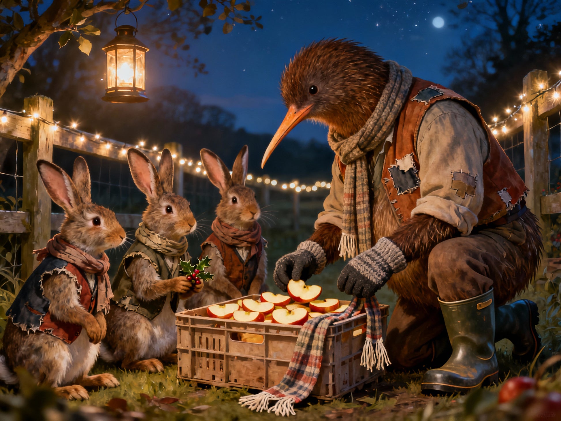 A heartwarming Christmas card of Farmer Bracken offering fresh apple slices to his rabbit friends. Dressed in his patched vest, scarf, and gumboots, Bracken kneels by a crate of apples, lit by a glowing lantern and festive string lights. The rabbits, wearing little scarves, gather eagerly with holly sprigs in paw, while the moon shines softly above the New Zealand farm. A rustic and tender holiday moment of friendship and giving.