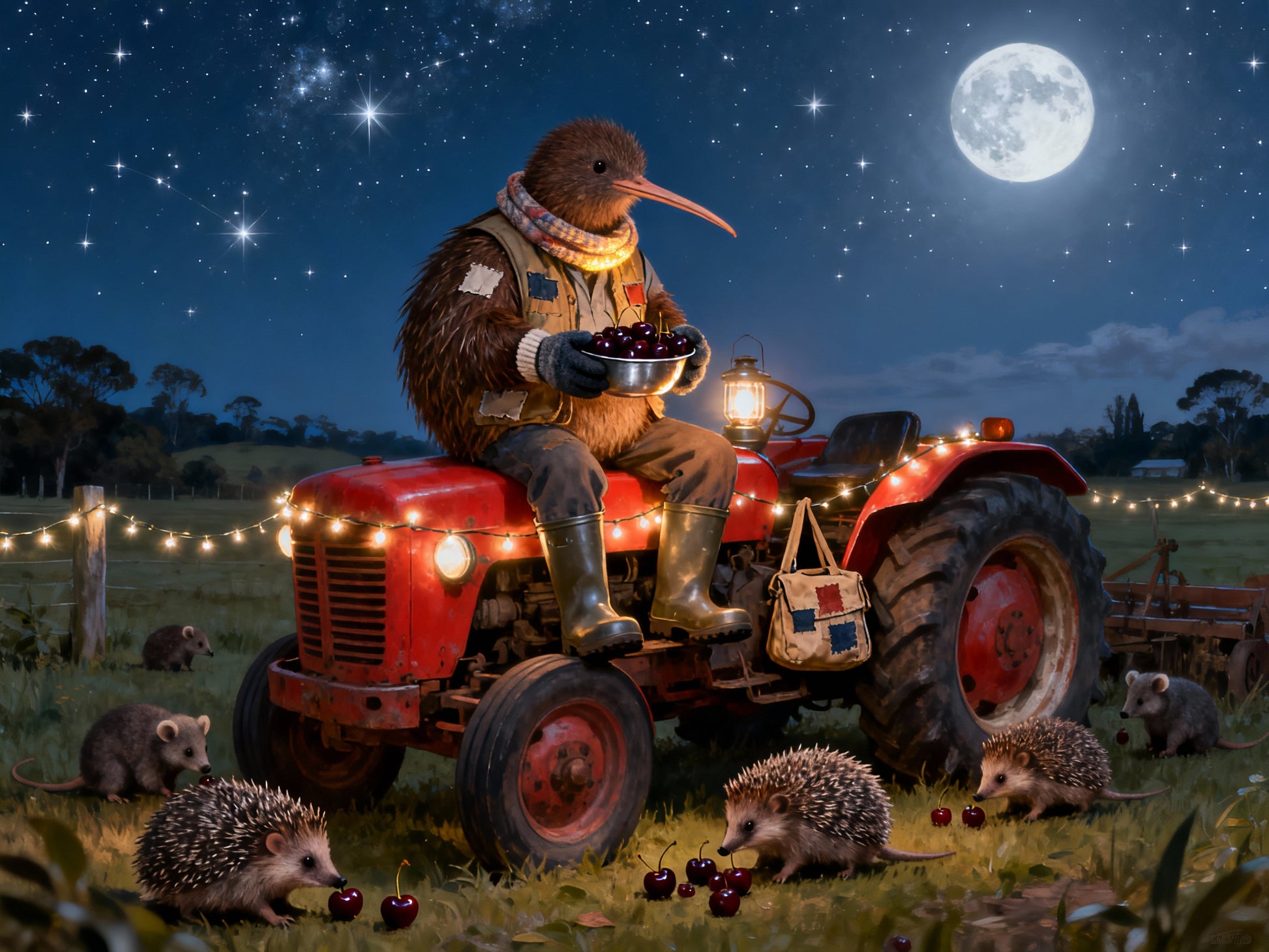 A whimsical New Zealand Christmas card featuring Farmer Bracken, the round kiwi bird farmer, perched atop his red tractor under the glowing full moon. He holds a bowl of fresh cherries, sharing them with hedgehogs and possums gathered below. String lights twinkle along the fence, filling the starry countryside night with rustic holiday magic. Printed on premium matte card stock with kraft envelope included, cards are blank inside for your own message.