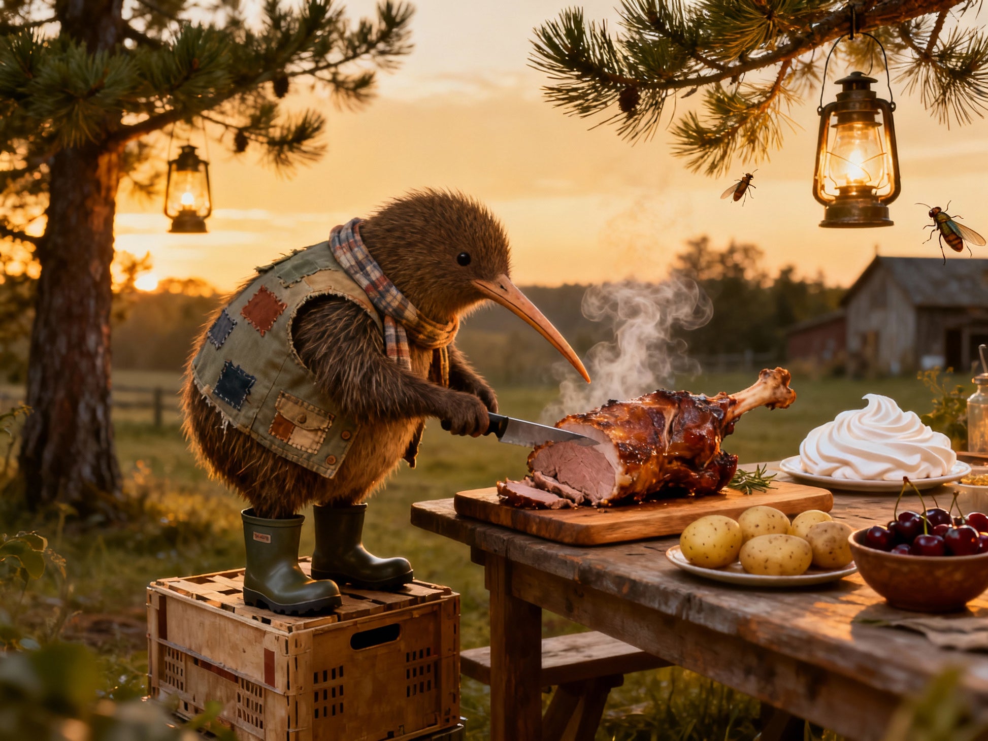 A rustic New Zealand Christmas card featuring Farmer Bracken, the round kiwi bird farmer, dressed in his patched vest, wool scarf, and gumboots. Standing on a crate at sunset, he carefully carves a steaming roast on the farm table, surrounded by potatoes, cherries, and a swirl of pavlova. Lanterns swing gently in the evening light, creating a warm, festive scene filled with humor and charm. Card is blank inside for your own holiday message.
