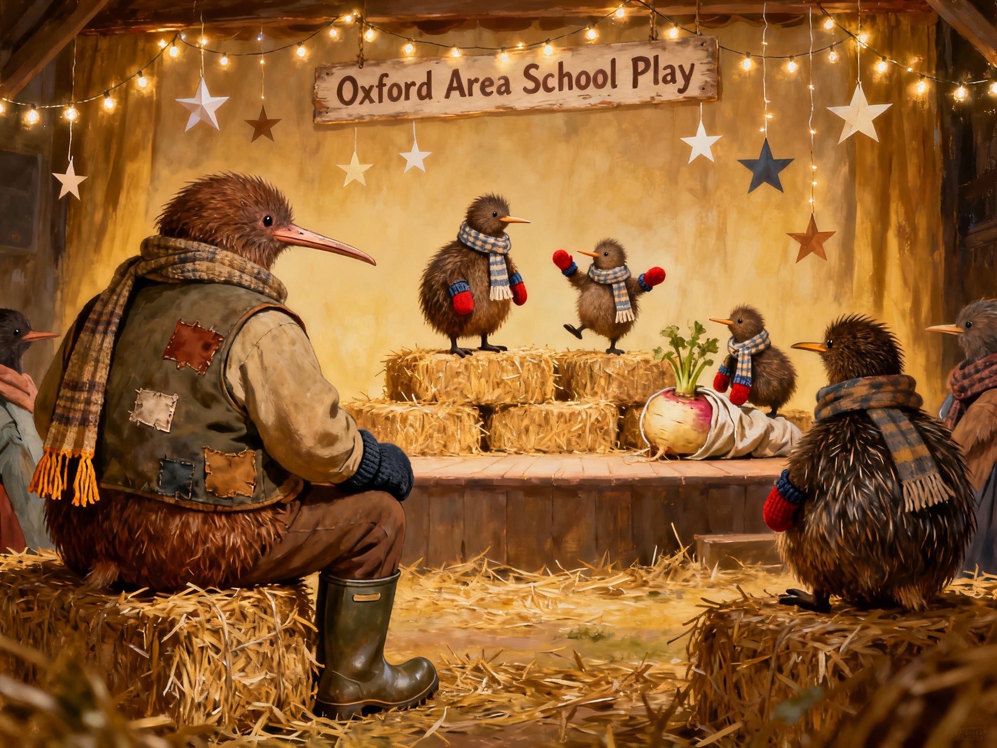 A whimsical New Zealand Christmas card featuring Farmer Bracken, the round kiwi bird farmer, seated proudly in his patched vest, scarf, and gumboots. In a barn decorated with twinkling lights and stars, young kiwi birds in scarves and mittens perform the “Oxford Area School Play” atop haybales, complete with a giant turnip prop. A humorous and heartwarming farmyard take on the Christmas play. Card is blank inside for your festive message.
