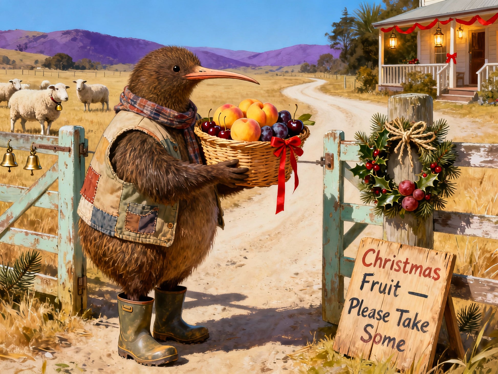 A rustic New Zealand Christmas card featuring Farmer Bracken, the round kiwi bird farmer, in his patched vest, scarf, and gumboots. At the farm gate, decorated with a wreath and bells, he sets out a woven basket filled with peaches, cherries, and plums beside a hand-painted sign that reads Christmas Fruit – Please Take Some. Sheep graze in the summer fields beyond, capturing a warm and generous Kiwi holiday tradition. Card is blank inside for your own festive message.