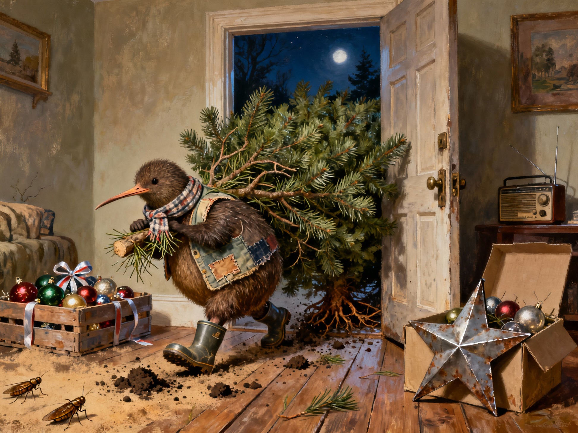 A whimsical Christmas card of a kiwi farmer dragging a pine tree inside on a moonlit night, scattering dirt across the floor. Crates of ornaments and a rustic star wait to be unpacked, ready for decorating. A charming New Zealand holiday scene filled with humor and warmth. Blank inside for your message.