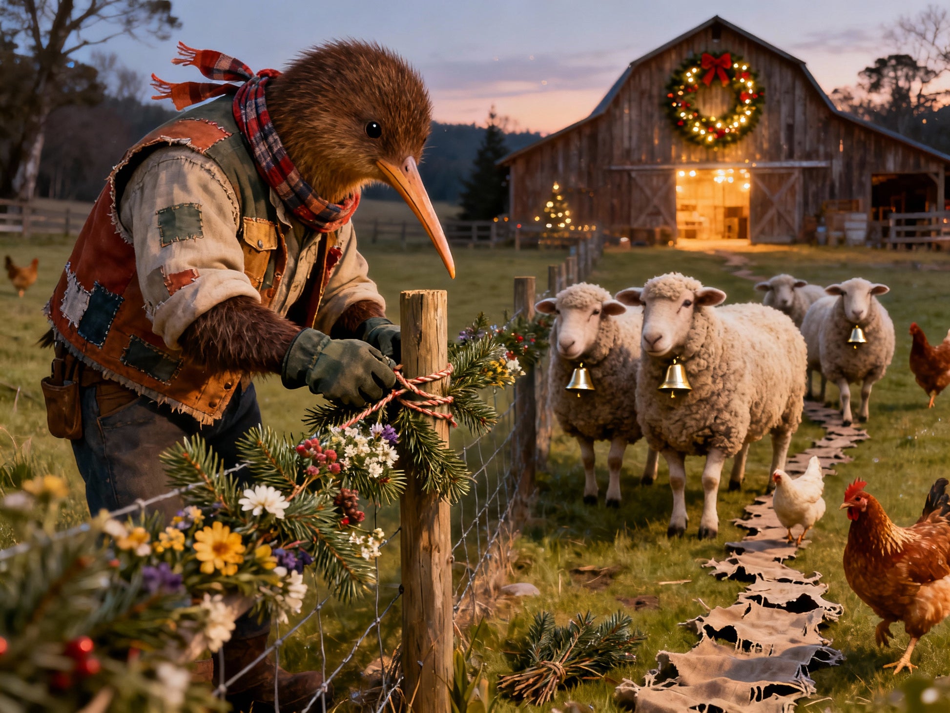 Farmer Bracken carefully ties a Christmas garland along a rustic farm fence at sunset. Behind him, a line of sheep wearing tiny jingle bells wait patiently, while chickens wander nearby. In the background, the barn glows warmly with wreaths, twinkling lights, and a Christmas tree, creating a cozy New Zealand farm holiday scene.