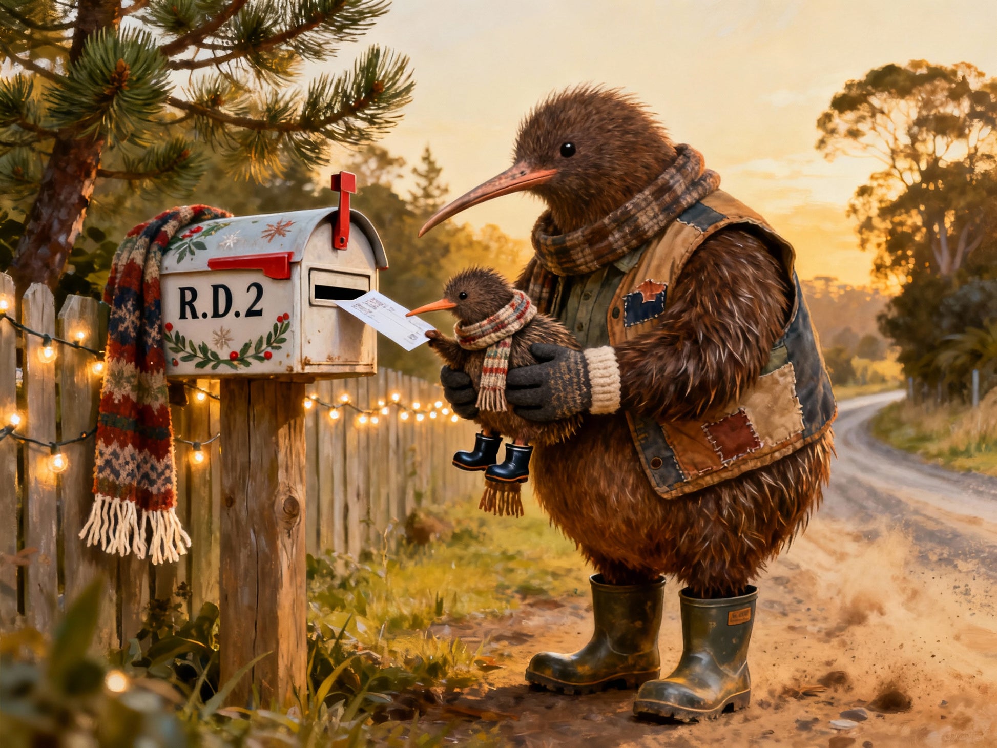 A festive New Zealand Christmas card featuring a kiwi farmer helping a baby kiwi post a holiday letter into a decorated rural mailbox marked R.D.2. String lights glow along the fence, and the scene captures the warmth and charm of a country Christmas at sunset. Blank inside for your message.