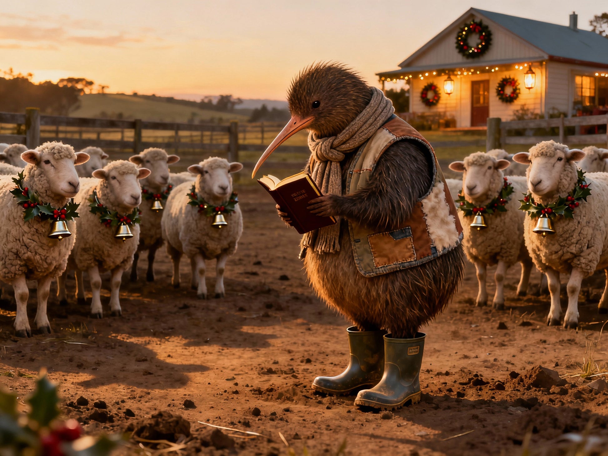 A heartwarming New Zealand Christmas card featuring a kiwi farmer reading aloud to a flock of sheep wearing festive holly wreaths with little golden bells. A farmhouse trimmed in wreaths and lights glows in the background at dusk, capturing the rustic warmth of a country holiday. Blank inside for your message.