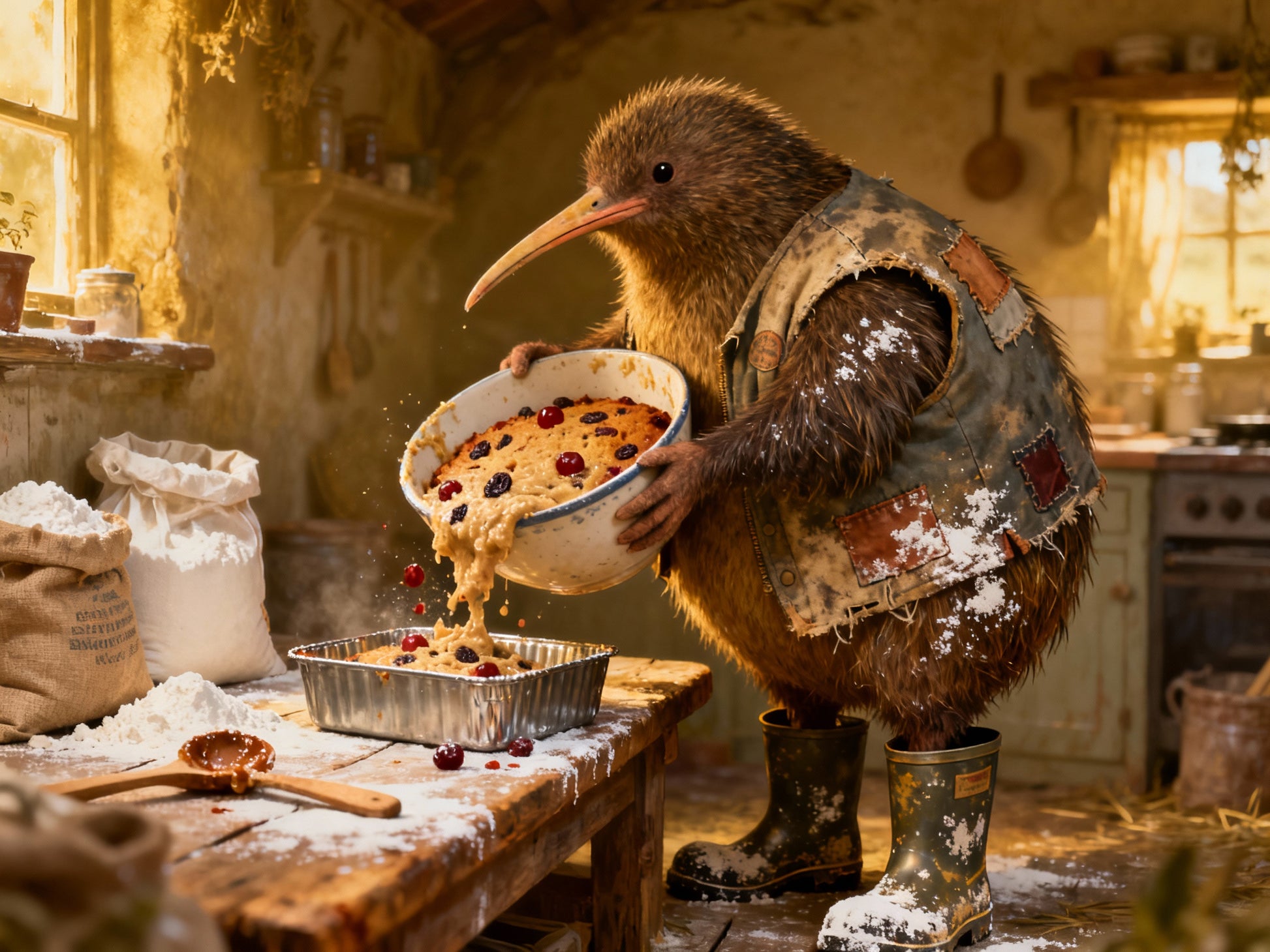 A homely New Zealand Christmas card featuring Farmer Bracken, the round kiwi bird farmer, pouring a bowl of fruitcake batter into a tin in a flour-dusted farmhouse kitchen. Sunlight streams through the window, catching the scattered cherries and raisins, and filling the rustic room with golden holiday warmth. Blank inside for your message.