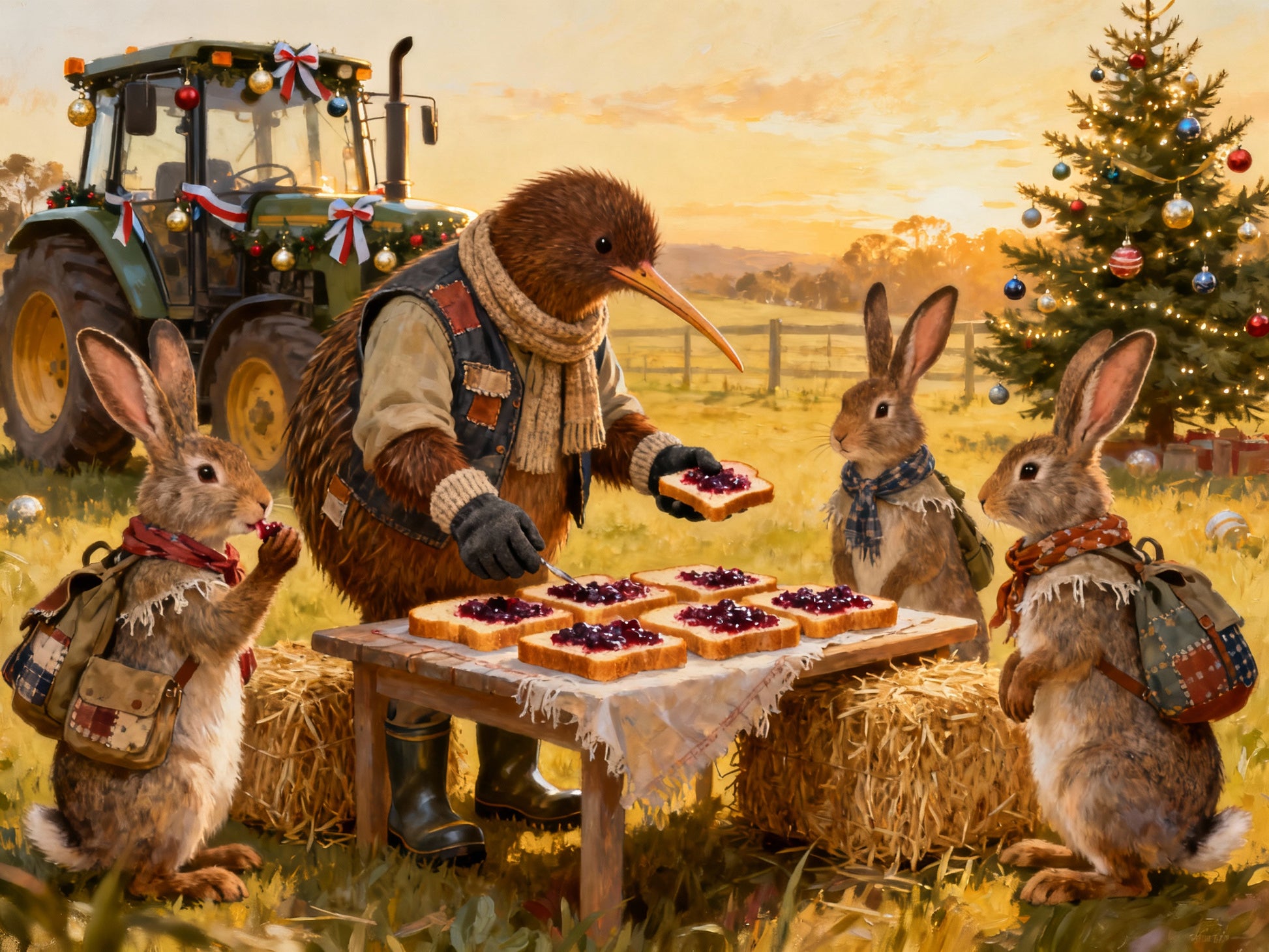 A whimsical New Zealand Christmas card featuring Farmer Bracken preparing slices of jam on bread for three delighted rabbits at a rustic outdoor table. Behind them, a decorated tractor and Christmas tree glow in the evening light, adding to the festive countryside atmosphere. This painterly holiday design captures warmth, humor, and rustic charm. Printed on premium matte card stock with kraft envelope included, blank inside for your own message.
