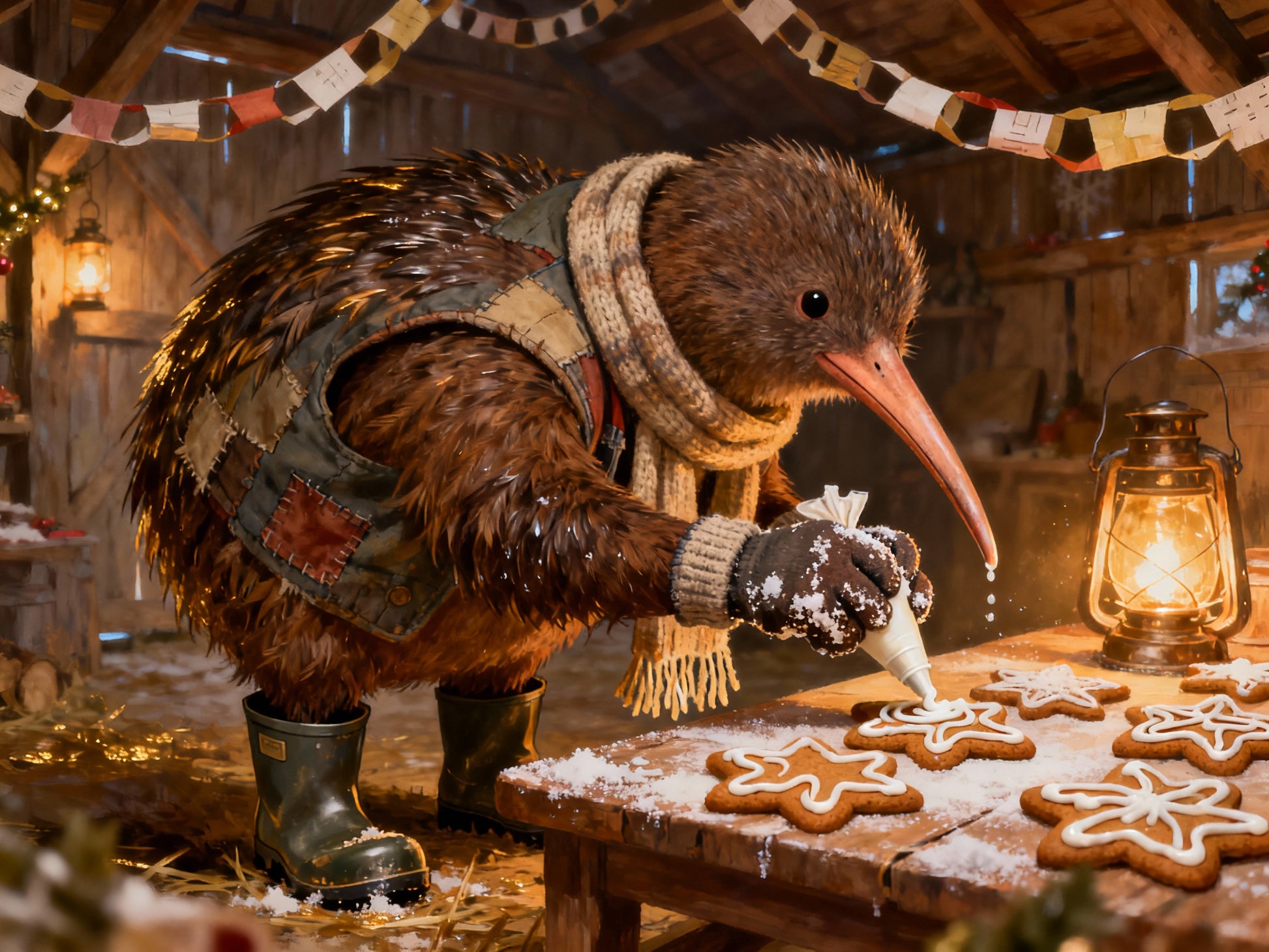 A cozy New Zealand Christmas card featuring Farmer Bracken, the round kiwi bird farmer, carefully icing a tray of gingerbread biscuits in a rustic barn. Lantern light glows warmly on the wooden table dusted with flour and sugar, while paper garlands hang above, capturing the handmade charm of a countryside holiday. Blank inside for your message.