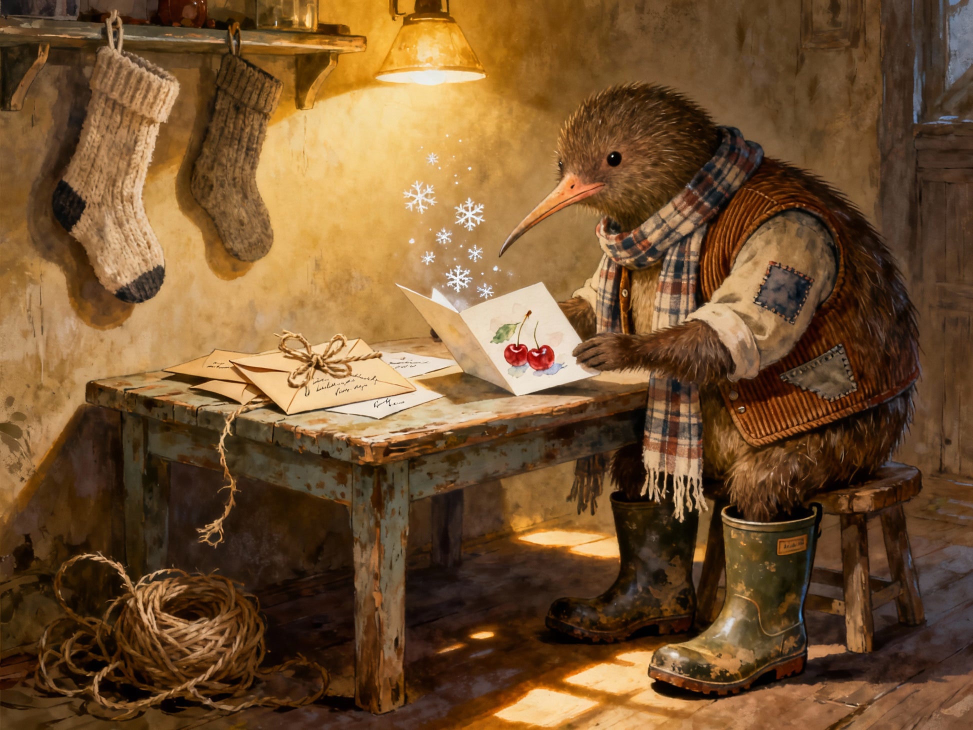 A nostalgic New Zealand Christmas card featuring Farmer Bracken, the round kiwi bird farmer, seated at a rustic wooden table as he opens a holiday card decorated with cherries. Snowflakes seem to sparkle in the lamplight while stockings hang on the wall and tied letters rest beside him, capturing the quiet magic of a country Christmas evening. Blank inside for your message.