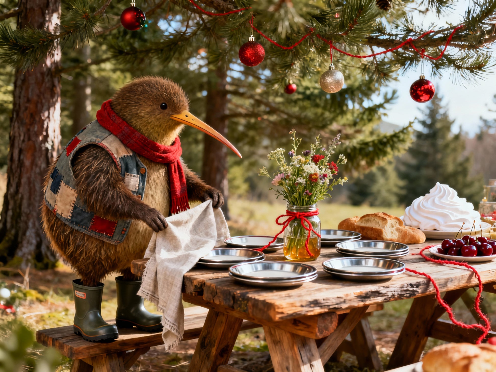 A festive New Zealand Christmas card featuring Farmer Bracken, the round kiwi bird farmer, carefully setting a rustic outdoor table under a pine tree adorned with ornaments. Fresh bread, cherries, and a pavlova wait to be shared, while wildflowers in a jar add a touch of country charm. A scene full of warmth, tradition, and holiday cheer.